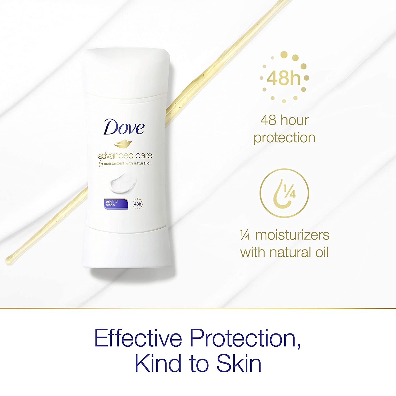 • Effective protection and kind to skin: Dove Advanced Care Original Clean Antiperspirant Deodorant Stick keeps your underarms dry and odor-free for up to 48 hours while being kind to your skin
