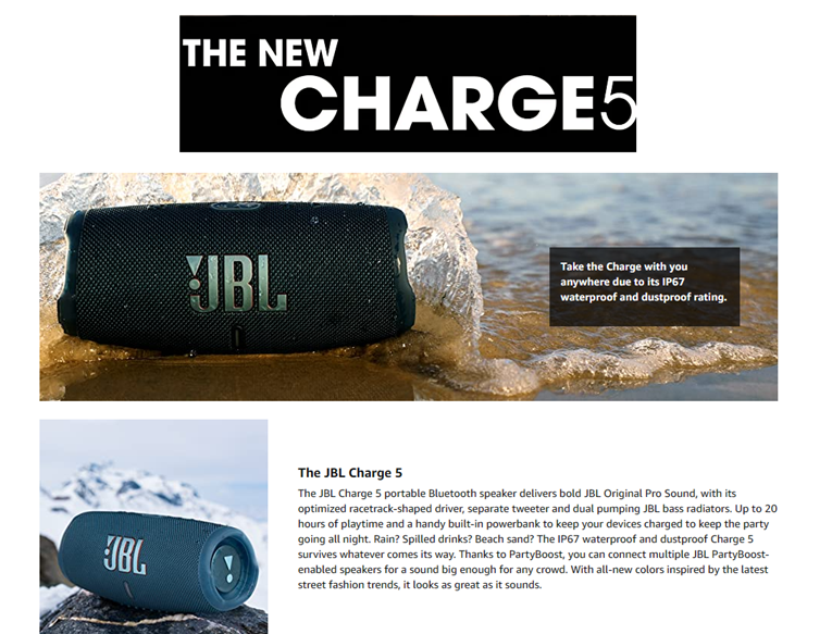 Take the party with you no matter what the weather. The JBL Charge 5 speaker delivers bold JBL Original Pro Sound, with its optimized long excursion driver, separate tweeter and dual pumping JBL bass radiators. Up to 20 hours of playtime and a handy powerbank to keep your devices charged to keep the party going all night. Rain? Spilled drinks? Beach sand? The IP67 waterproof and dustproof Charge 5 survives whatever comes its way. Thanks to PartyBoost, you can connect multiple JBL PartyBoost-enabled speakers for a sound big enough for any crowd. With all-new colors inspired by the latest street fashion trends, it looks as great as it sounds.