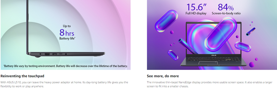 The ASUS Laptop L510MA is designed to help you be productive all day — even when you’re on the move. This compact and lightweight 14 inch laptop is powered by the latest Intel® processor and provides long lasting battery life. With eMMC storage and pre-loaded Windows 10 in S mode, it offers full compatibility with a wide range of software and peripherals. It’s the best laptop for people on the go. *The actual transfer speed of USB 3.0, 3.1, 3.2 (Gen 1 and 2), and/or Type-C will vary depending on many factors including the processing speed of the host device, file attributes and other factors related to system configuration and your operating environment. For Free Windows 11 upgrade eligible devices, visit ASUS Windows 11 website for more information.
