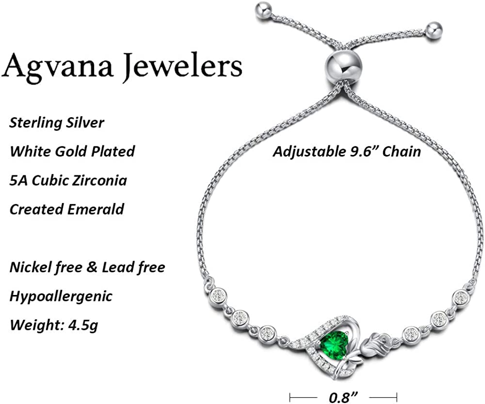 ?Emerald Heart Bracelet:? The womens bracelet is made up of sterling silver and plated with white gold, and the pendant is set a 0.8 Carat May Birthstone - Created Emerald. Design some 5A cubic zirconia beside the rose flower pendant look more elegant and luxurier. The length of adjustable tennis bracelet is up to 9.6", which fits for most female. Rose Flower Pendant size is 0.8"*0.5", Bracelet Weight: 4.5g