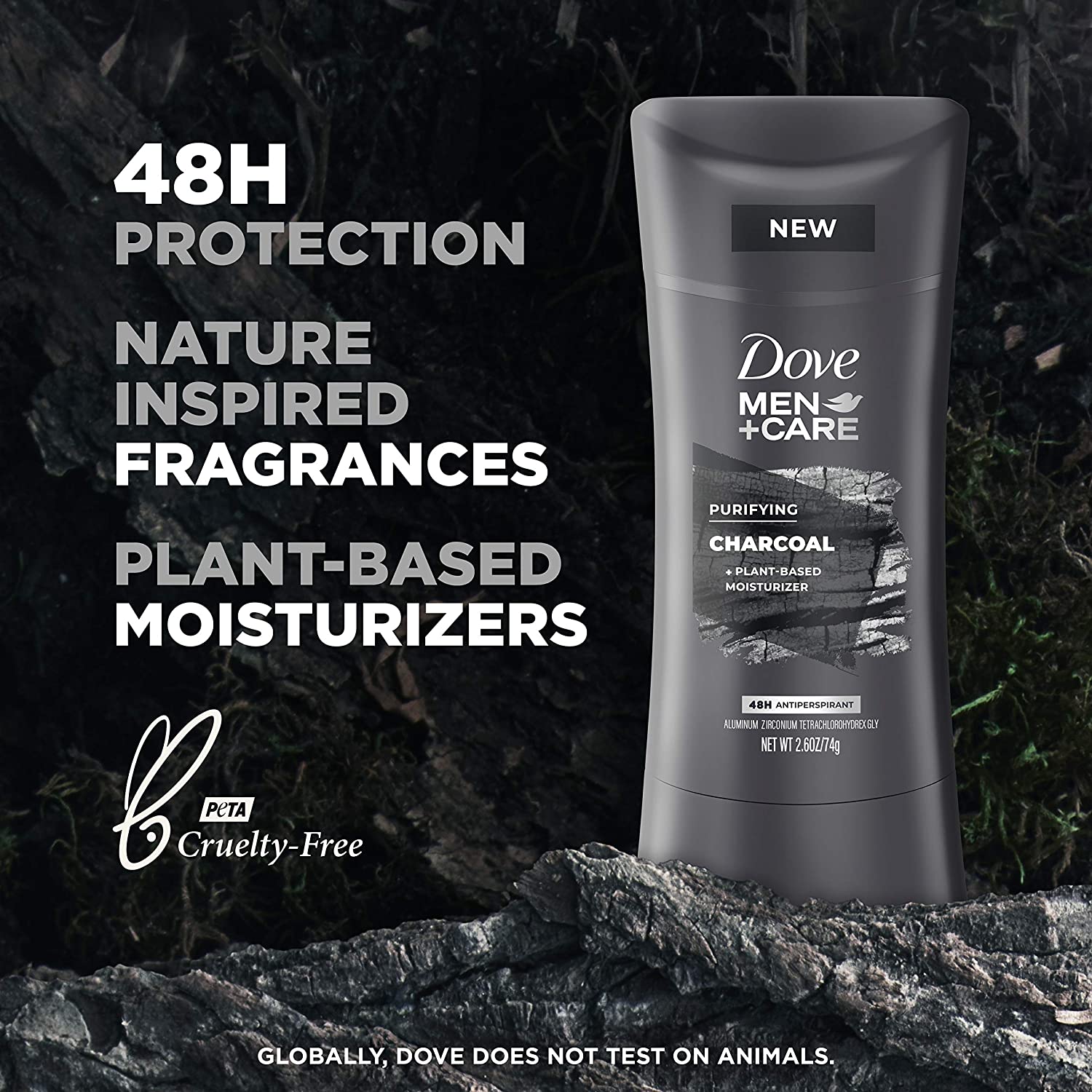 • NEW Dove Men+Care Charcoal Antiperspirant delivers long-lasting 48-hour protection against odor with a purifying scent derived from natural essential oils.