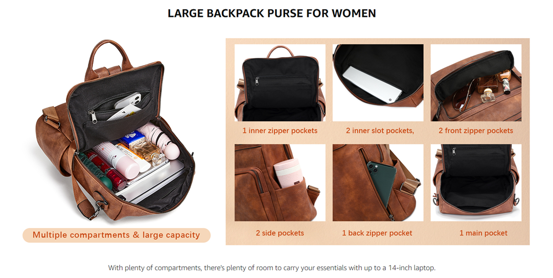 • 【CONSTRUCTION & LARGE CAPACITY】 This leather backpack purse for women adopts a double zipper with a large vertical opening at the top, which is very convenient for loading items. 1 inner zipper pockets, 2 inner slot pockets, 2 front zipper pockets, 2 side pockets, and 1 back zipper pocket. Multiple pockets can keep your things well organized.