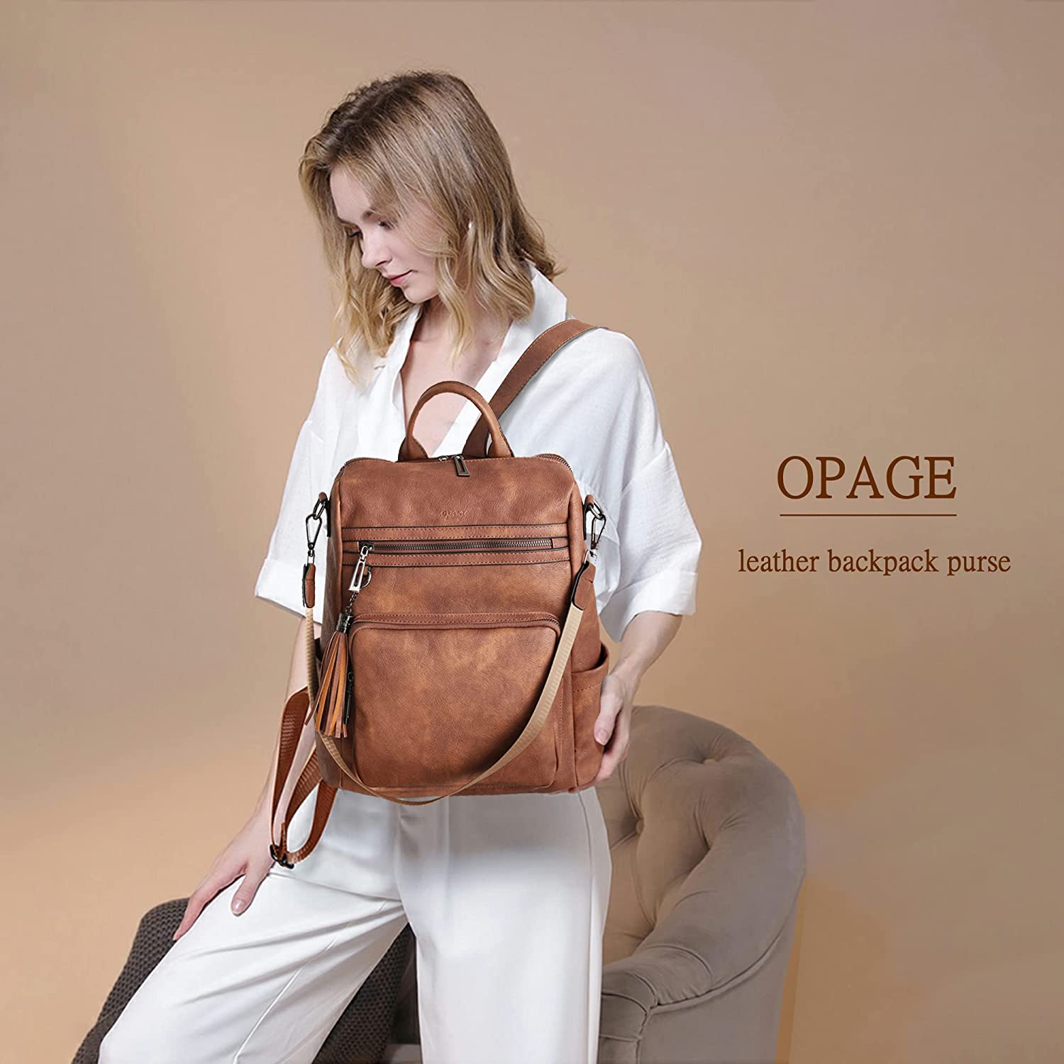 OPAGE Leather Backpack Purse for Women Fashion Tassel Ladies Shoulder Bags Designer Large Backpack Travel Bag