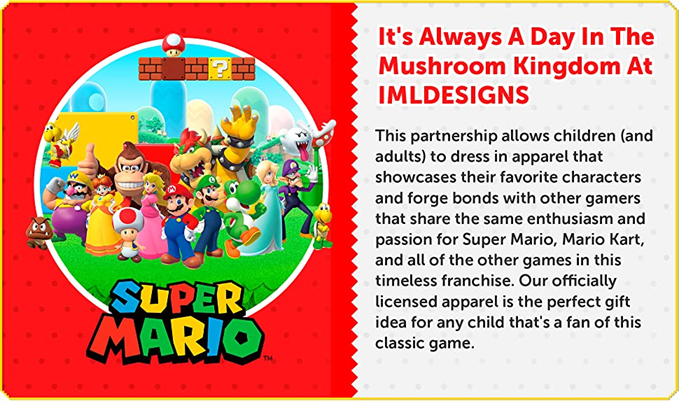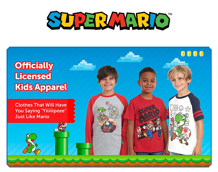 • SUPER MARIO BROS SHIRTS FOR KIDS: These 100% cotton shirts are perfect for any little boy who loves playing Nintendo games! The shirts come in multiple colors and designs, including cool prints featuring everyone's favorite character Mario.