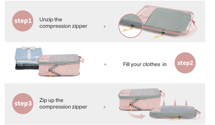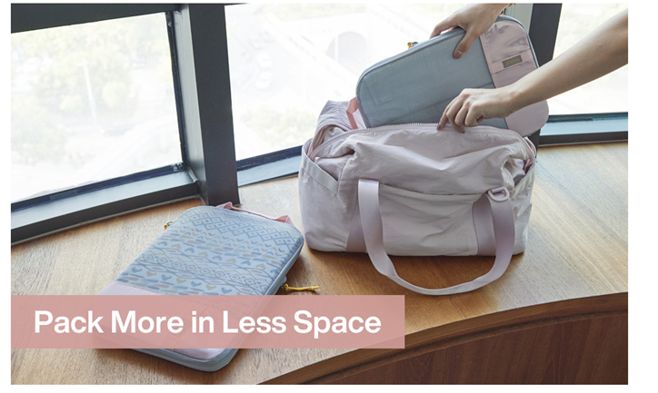 • True Space Saving - This compression travel cubes is kind of like how a vacuum sealer works. Done by adding an extra zipper around the outside that can be zipped up to help squash clothes down and minimize the space inside. It’s remarkable how much of a difference they can make. Help travelers “Fit Double the Amount” in their suitcases.