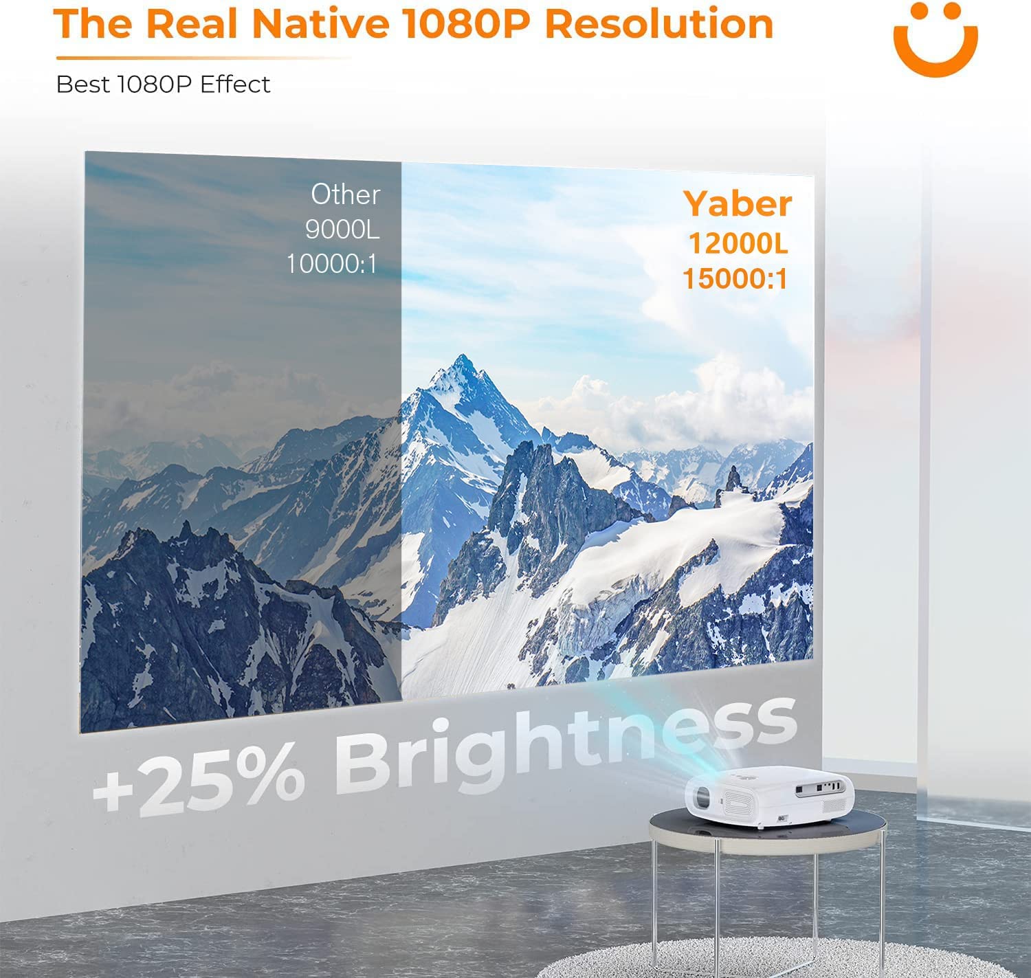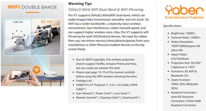 YABER Pro V7 is the first one projector after the upgrade of the YABER brand. With these three innovative functions: Unique Auto 6D Keystone Correction(allows V7 to automatically correct to a rectangle under any trapezoid)5GHz/2.4GHz WiFi dual-band and +25% Brighter than all other 1080P LCD projectors. It adopts YABER innovative BASIC Smart Engine, advanced German LED light source and delicate manufacturing process. 1920*1080P Native resolution, 12000 L brightness, 15000:1 contrast, the 350" large screen of the YABER Pro V7 projector has excellent image size, rich, brilliant colors and impressive Deeply incredible sound effects.
