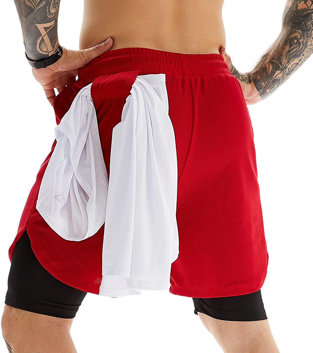 2-IN-1 DESIGN: Outer layer of this mens workout running shorts is 100% polyester mesh fabric, perfectly anti-pilling and breathable. The built-in workout shorts compression liner is 20% spandex and 80% polyester, elastic and skin-friendly enough for muscle healing.