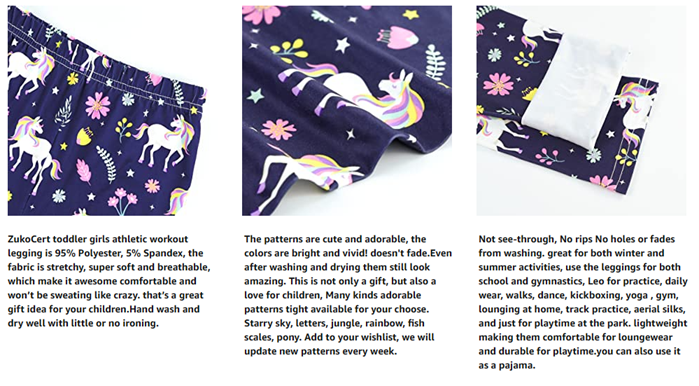 【QUALITY FABRIC】: This girls leggings is 95% Polyester & 5% Spandex. the fabric is stretchy, super soft, and breathable, This makes this girls athletic leggings awesome comfortable,no-fuss moveability. Price is fair, that’s a great gift idea for your kids leggings. Hand washes and dry well with little or no ironing.