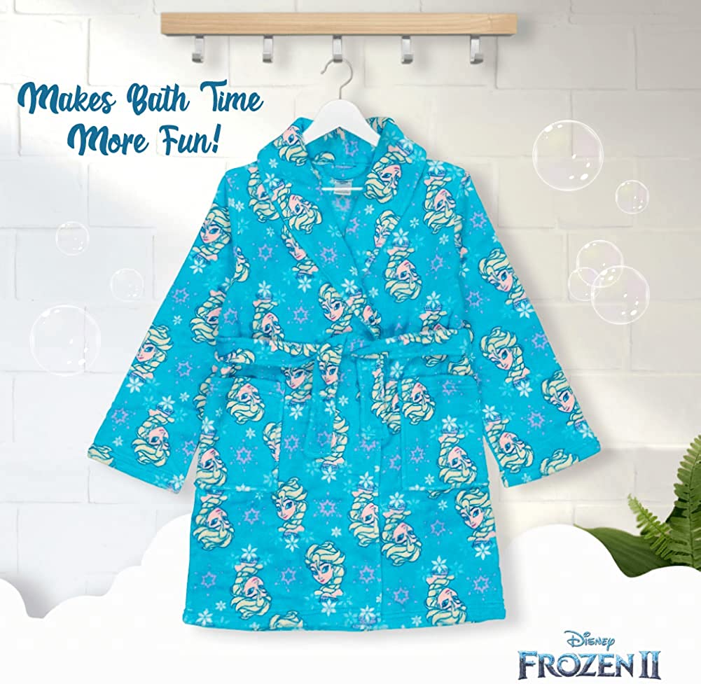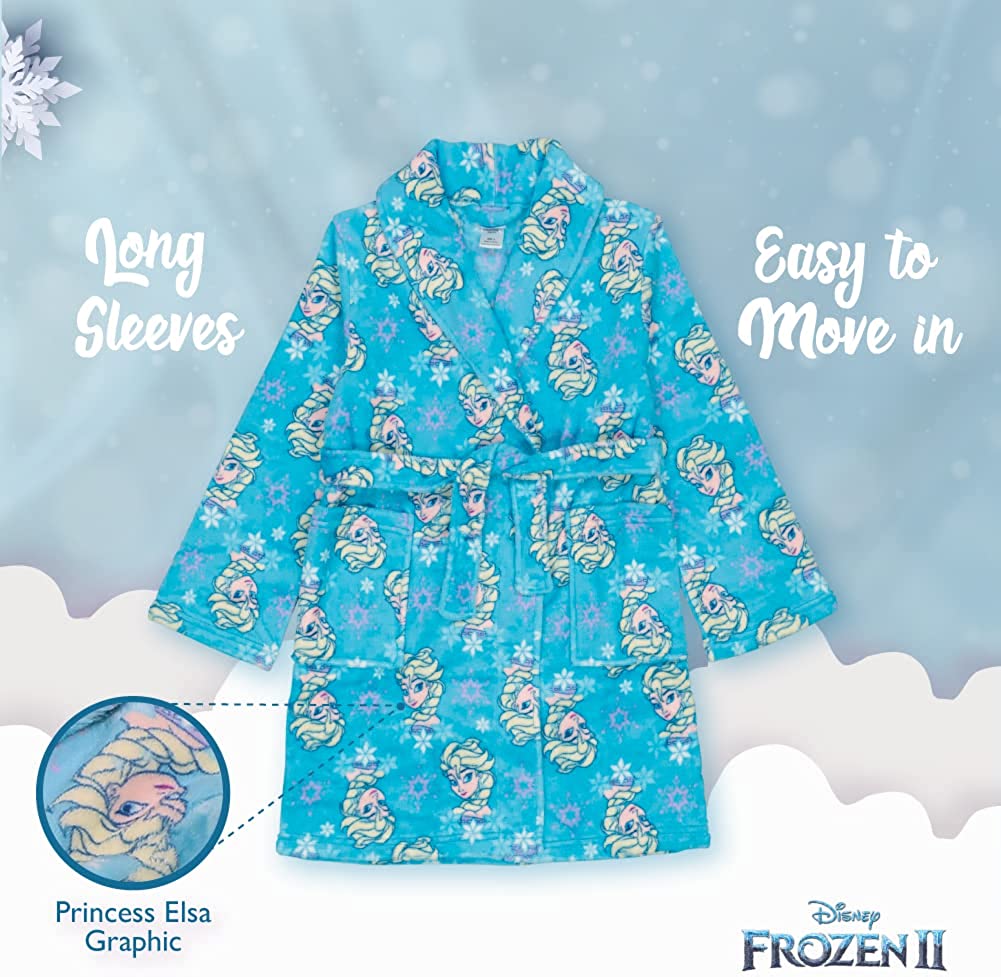 • ENJOYABLE GIRLS’ BATHROBE: Our fun Disney “Frozen” plush robe is soft and loose-fitting and features charming, detailed graphics of Elsa. This cute and comfortable bathrobe for girls is available in sizes 2T–4T and 4–10.