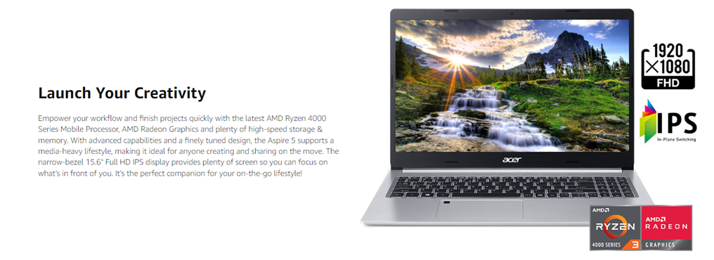 Acer Aspire 5 A515-44-R41B comes with these high level specs AMD Ryzen 5 4500U Hexa-Core Mobile Processor with Radeon Graphics (2.3GHz and with Precision Boost up to 4.0GHz), Windows 10 Home, 15.6" Full HD (1920 x 1080) Widescreen LED-backlit IPS Display, 8GB DDR4 Memory, 256GB NVMe SSD, TrueHarmony Gen 2 Technology, Two Built-in Stereo Speakers, Acer Purified.Voice Technology with Two Built-in Microphones, 802.11ac WiFi 5 (Dual-Band 2.4GHz and 5GHz), 10/100/1000 Gigabit Ethernet LAN (RJ-45 port), Bluetooth 5.0, Back-lit Keyboard, HD Webcam (1280 x 720), 1 - USB 3.2 (Type-C) Gen 1 port (up to 5 Gbps), 2 - USB 3.2 Gen 1 Port (one with Power-off Charging), 1 - USB 2.0 Port, 1 - HDMI Port with HDCP support, Lithium-Ion Battery Up to 10-hours Battery Life, 4.19 lbs 1.9 kg (system unit only) (NX.HW4AA.003).