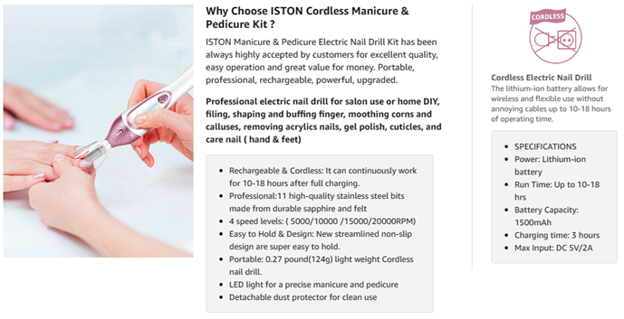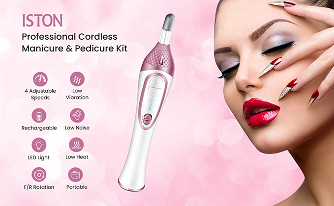 ★【What You Received & 100% Customer-Happy】The professional manicure set includes all necessary pedicure manicure kit: electric nail file, 11 high quality Nail Drill bits, 20 sanding bands, USB charging cable, dust protector, a storage case and 5-Year Warranty.Our ISTON manicure tools has approved the RoHS MSDS CE Certificate. Give you a safe and the best manicure experience. please let us know if there is any problem occurs about our manicure pedicure kit. we will assist you within 12 hrs.