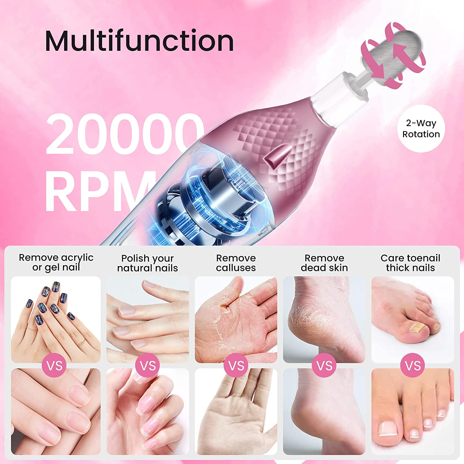 ★【4 Speed Settings Up to 20000RPM】 Electric nail drill designed with four adjustable speeds and support Forward/ Reverse direction (Speed 1: 5000RPM ; Speed 2: 10000RPM ; Speed 3: 15000RPM ; Speed 4: 20000RPM), which makes this electric nail file easier to polish your nails. Powerful enough for giving you a great precise nail grinding effect and flawless salon nails meanwhile there is no need to worry about hurting your nails.