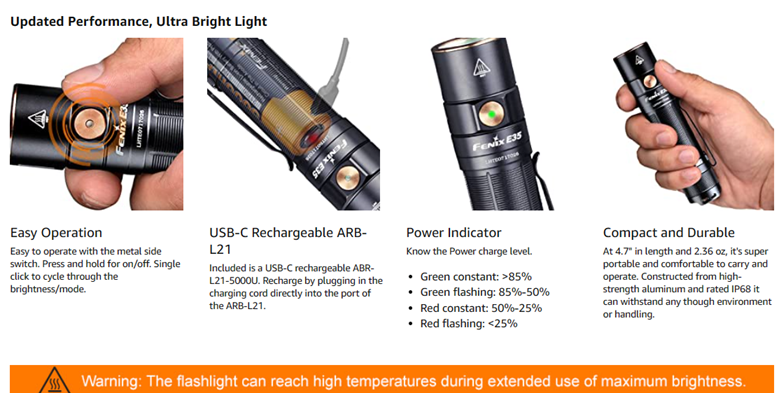| Included Components | Fenix E35 V3.0, LumenTac Organizer |