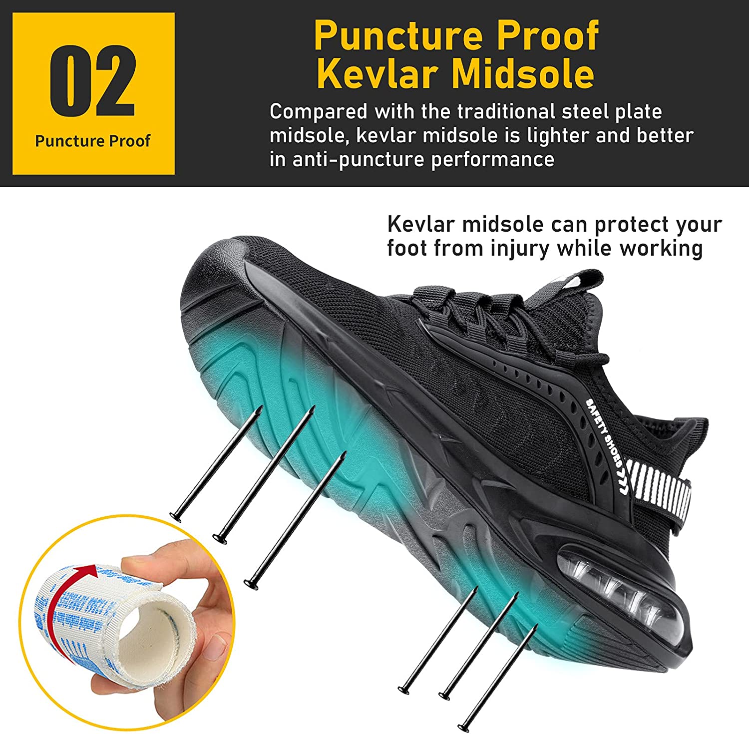 【Puncture Resistant】: Steel toe sneakers with lightweight Kevlar-midsole is built to protect your feet from being punctured by sharp objects like nails, steel bar.