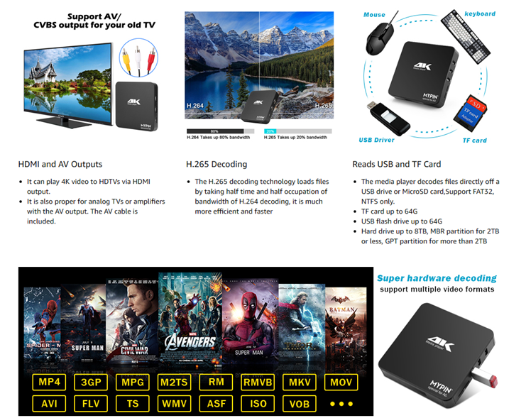 - Package: 1x 4K HD Media Player, 1x Power Supply, 1x AV Cable , 1x HDMI 2.0 Cable , 1x Remote Control (work with AAA battery, not included) , 1x User Manual