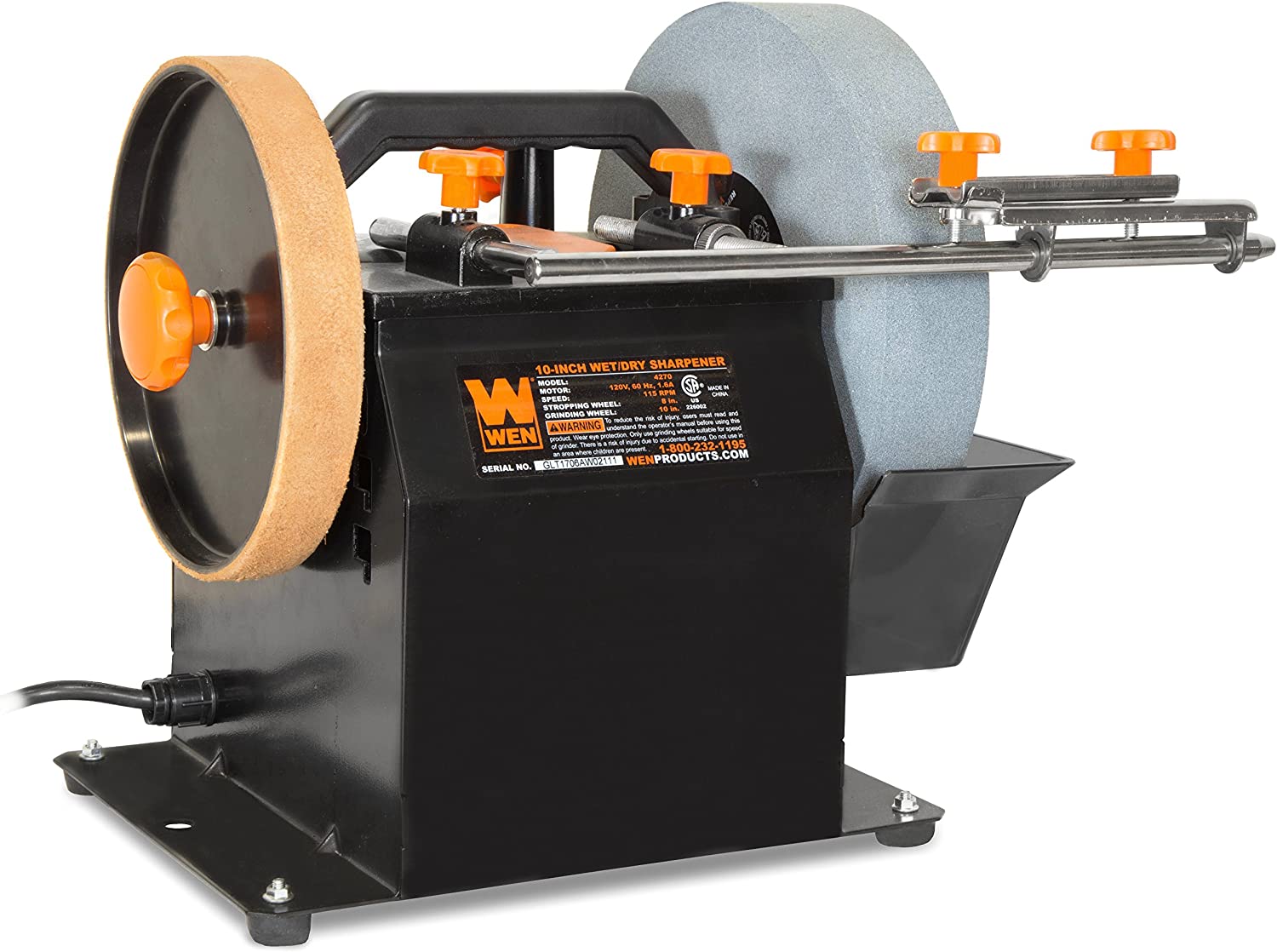 Create the sharpest edges known to man with the WEN 10-Inch Two-Direction Water Cooled Wet and Dry Sharpening System. Boasting a 10-inch by 2-inch 220 grit wet sharpening stone and an 8-inch by 1-1/8-inch leather stropping wheel, you’ll have everything you need to bring dull tools back to life. The heavy-duty 1.6A motor quietly rotates the wheels at an earnest 115 RPM for maximum precision during operation. Once the edge is nice and sharp, polish and finish the surface on the leather stropping wheel with the included honing compound. Resuscitate dull blades, wood chisels, carving tools, scissors, screwdrivers, lathe tools, axes and more. Reverse the rotational direction with the simple flip of a switch to meet the needs of any task. The universal support adjusts to both horizontal and vertical positions, allowing for jigs and other accessories to be utilized with the machine. The WEN 10-inch Wet/Dry Sharpener also includes an angle guide, a height adjustable water reservoir, and a jig for sharpening planer blades and chisels. The WEN 42704B 4-Piece Sharpening Accessory Kit is also available for other blade styles. The carrying handle makes transportation easier than ever while the mounting brackets combined with the sturdy base prevent walking and wobbling during operation. And, because its a WEN product, your 10-Inch Wet and Dry Sharpening System comes backed by a two year warranty, a nationwide network of skilled service technicians and a friendly customer phone line.