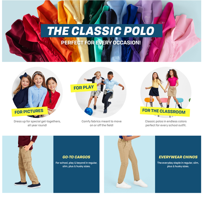 • THE CHILDREN'S PLACE — We offer a huge selection of kid's clothing! Shop us for jeans, shorts, leggings, chinos, polo shirts, dresses, pajamas, and accessories.