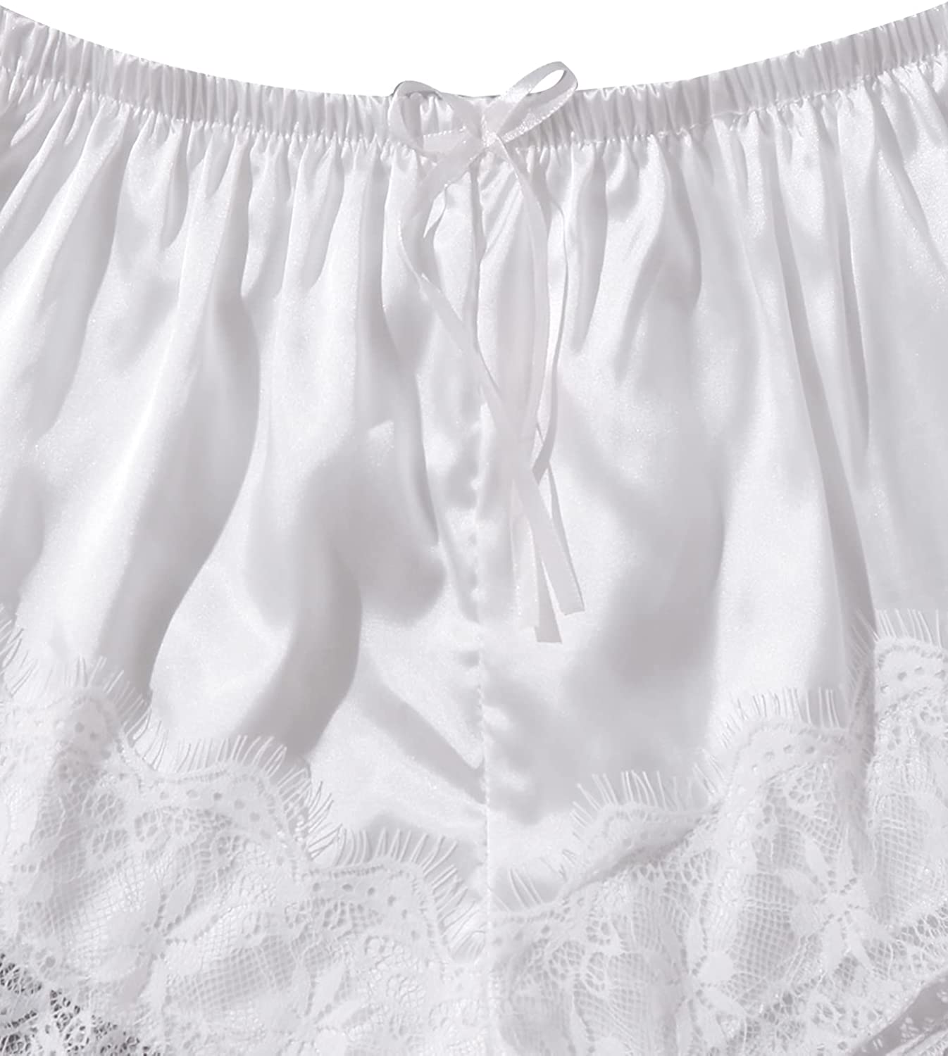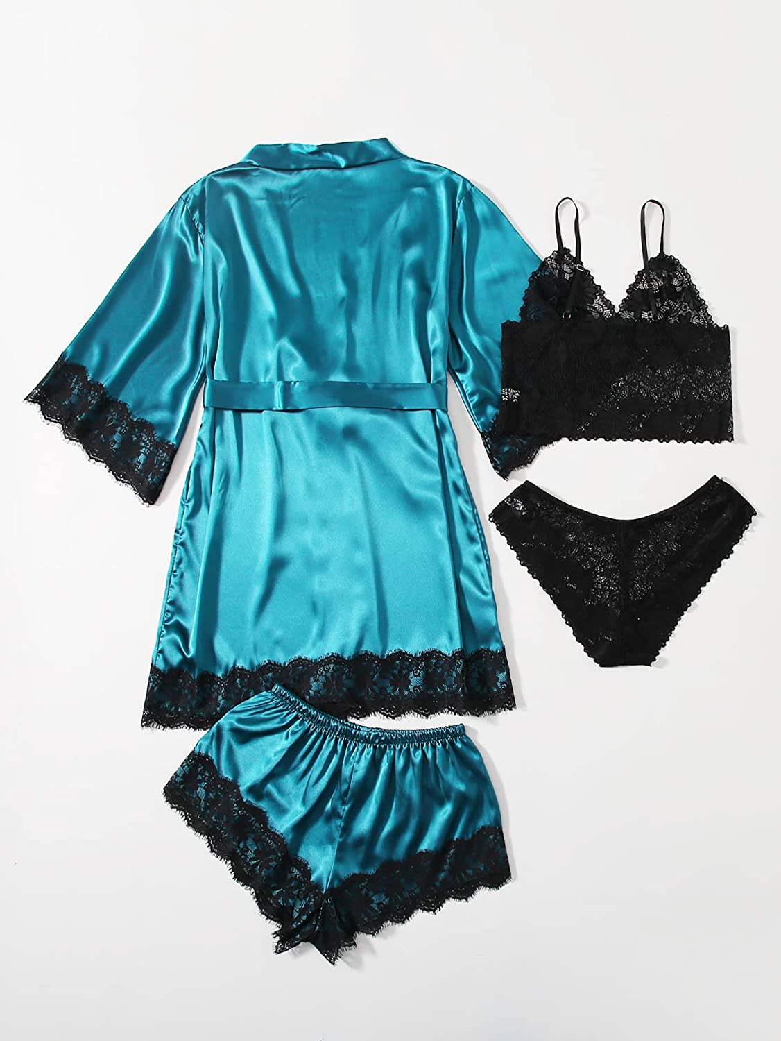 SOLY HUX Women's Satin Pajama Set 4pcs Floral Lace Trim Cami Lingerie Sleepwear with Robe