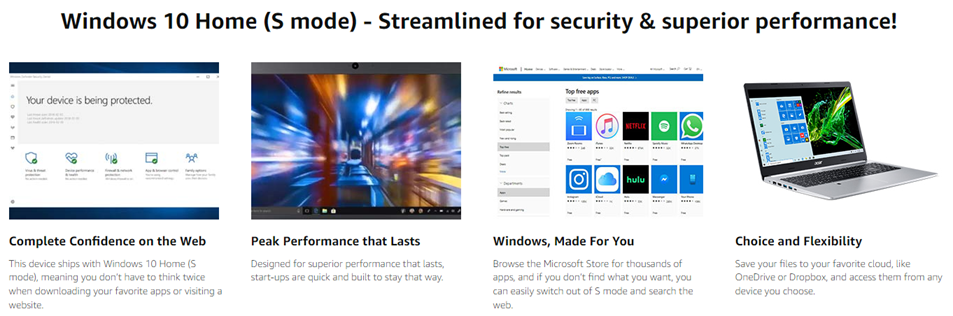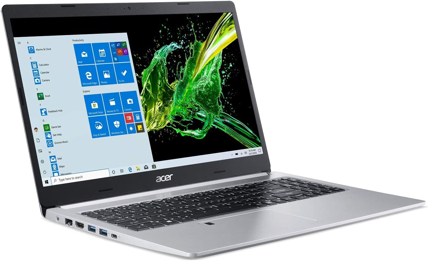 Acer Aspire 5 A515-55-35SE comes with these high level specs: 10th Generation Intel Core i3-1005G1 Processor 1.2GHz with Turbo Boost Technology up to 3.4GHz (4MB Smart cache), 15.6" Full HD (1920 x 1080) widescreen LED-backlit IPS Display, Intel UHD Graphics, 4GB DDR4 On-Board Memory, 128GB NVMe SSD, 1 - Available Hard Drive Bay, True Harmony Gen 2 Technology, Two Built-in Stereo Speakers, Acer Purified.Voice Technology with Two Built-in Microphones, Intel Wireless Wi-Fi 6 AX201 802.11ax Dual-Band 2.4GHz and 5GHz featuring 2x2 MU-MIMO technology (Max Speed up to 2.4Gbps), 10/100/1000 Gigabit Ethernet LAN (RJ-45 port), Bluetooth 5.0, Back-lit Keyboard, Acer Fingerprint Reader supporting Windows Hello, HD Webcam (1280 x 720), 1 - USB 3.1 (Type-C) Gen 1 port (up to 5 Gbps), 2 - USB 3.1 Gen 1 Port (one with Power-off Charging), 1 - USB 2.0 Port, 1 - HDMI Port with HDCP support, Lithium-Ion Battery, Up to 8-hours Battery Life, Windows 10 Home (S mode), 3.97 lbs. | 1.8 kg (system unit only) (NX.HSPAA.00A)