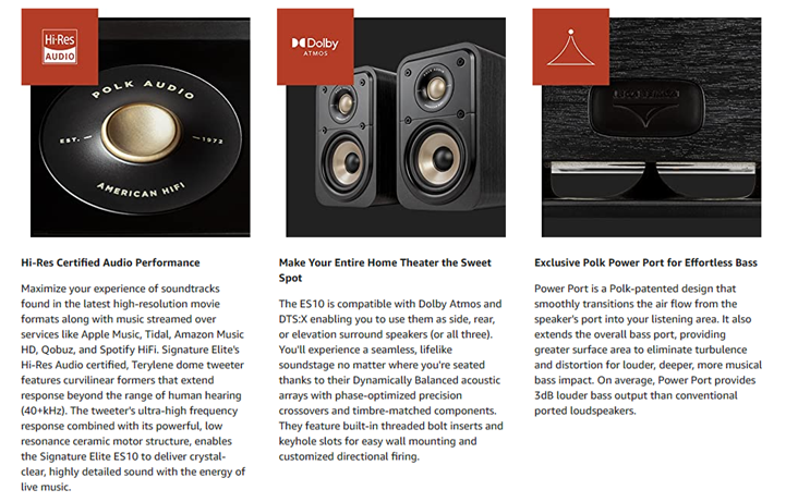 Enjoy movies, gaming, and multi-channel music in high-resolution cinematic sound with Polk’s full-range ES10 wall-mountable, compact surround loudspeaker. Featuring a Dynamically Balanced acoustic array with a 1” High-Resolution Terylene Tweeter, a 4” Mica-Fortified Polypropylene Woofer, and Precision Crossovers, the ES10 delivers crystal-clear, highly detailed sound with the energy of live music – no matter what you’re listening to or where you’re sitting in the room. Polk’s Patented Power Port Bass Enhancing Technology extends the overall bass port and provides greater surface area for distortion-free, louder bass impact. It is Hi-Res Audio Certified and ensures accurate sound reproduction from even the latest Dolby Atmos and DTS:X surround sound AVRs and amplifiers. The Signature Elite Series is designed with quality, timbre-matched Polk components to enable you to mix and match models and build your dream home theater or music listening environment. Add the Signature Elite ES60 tower pair, ES35 center channel and any sub for a complete 5.1 surround setup.