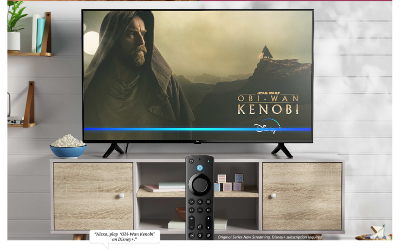 This bundle includes an Amazon Fire TV 43" 4-Series, Sanus Universal Tilting Wall Mount, and Mission Cables Red Remote Cover.