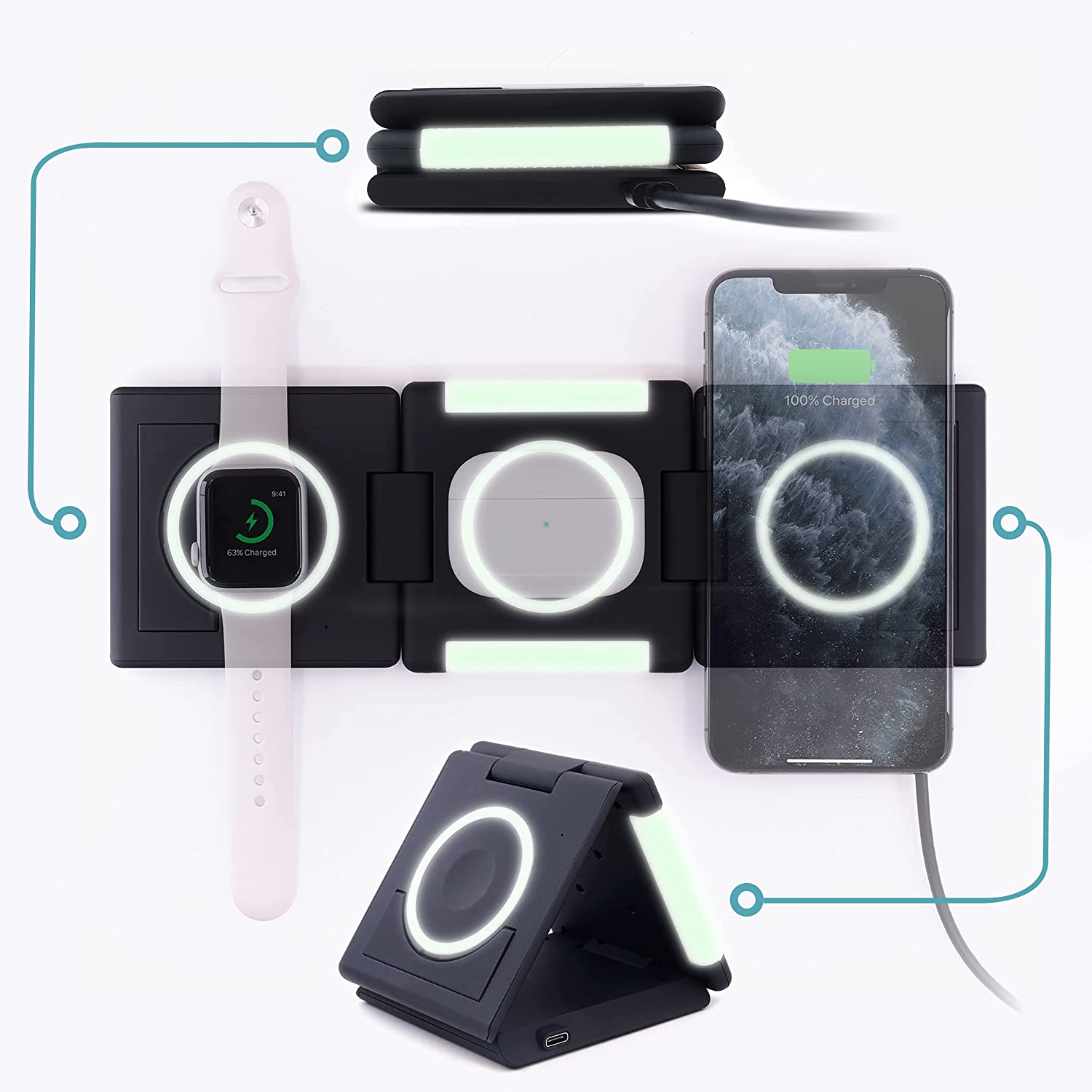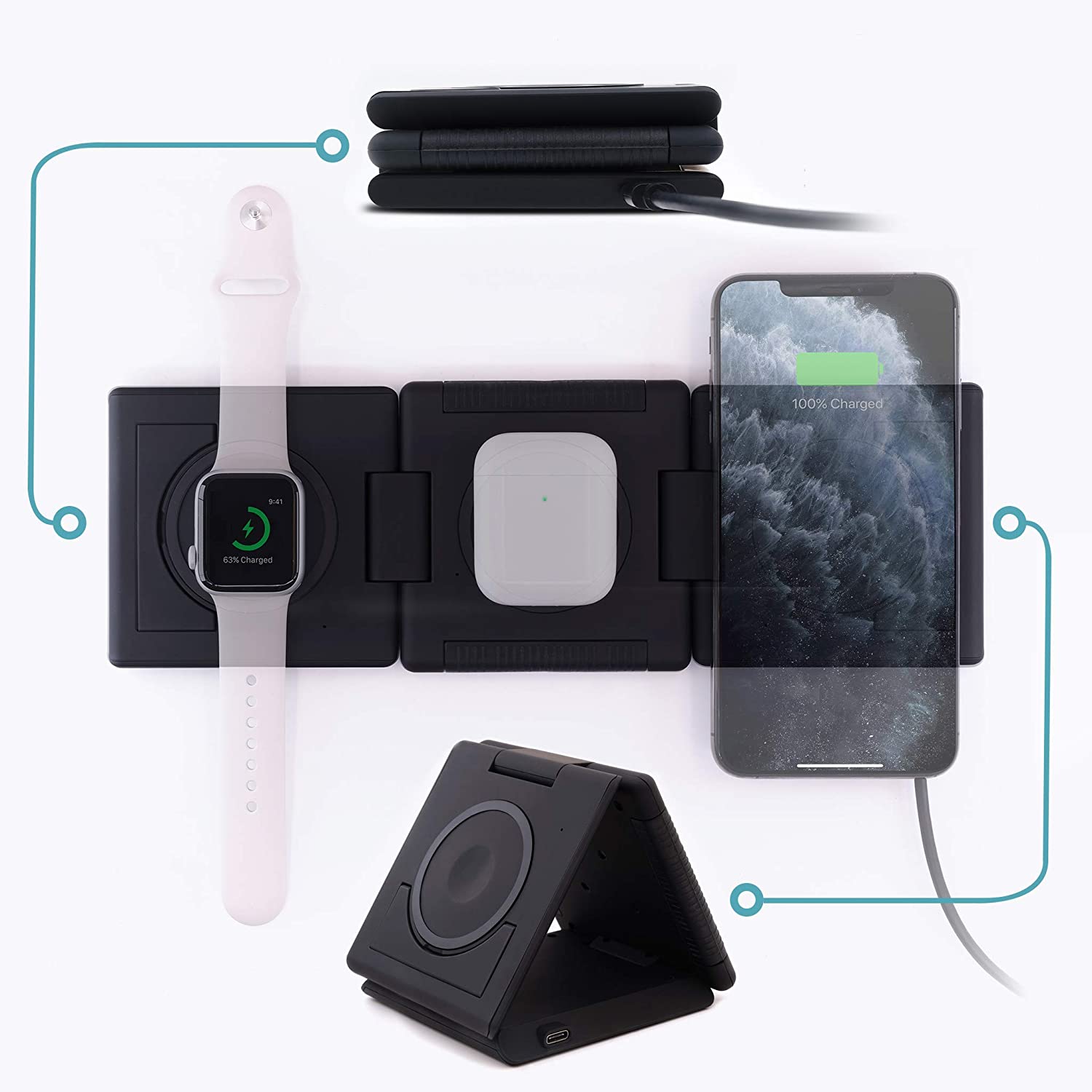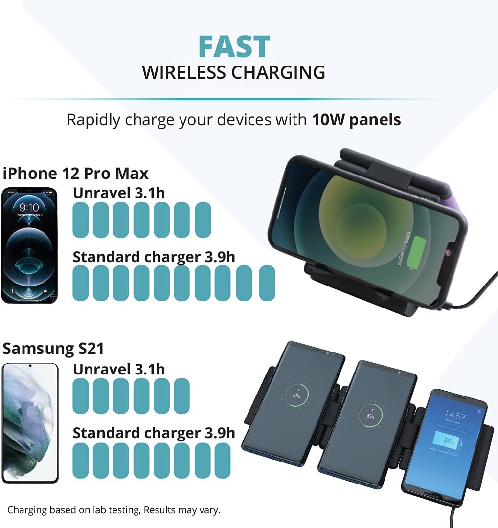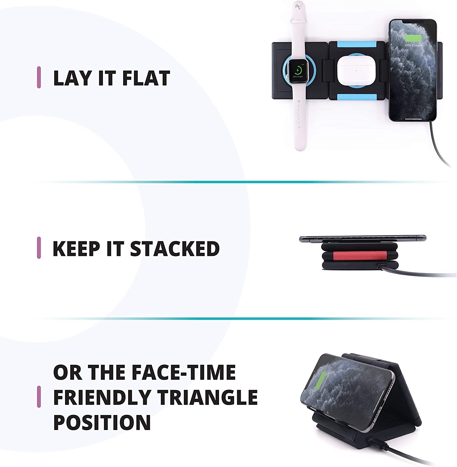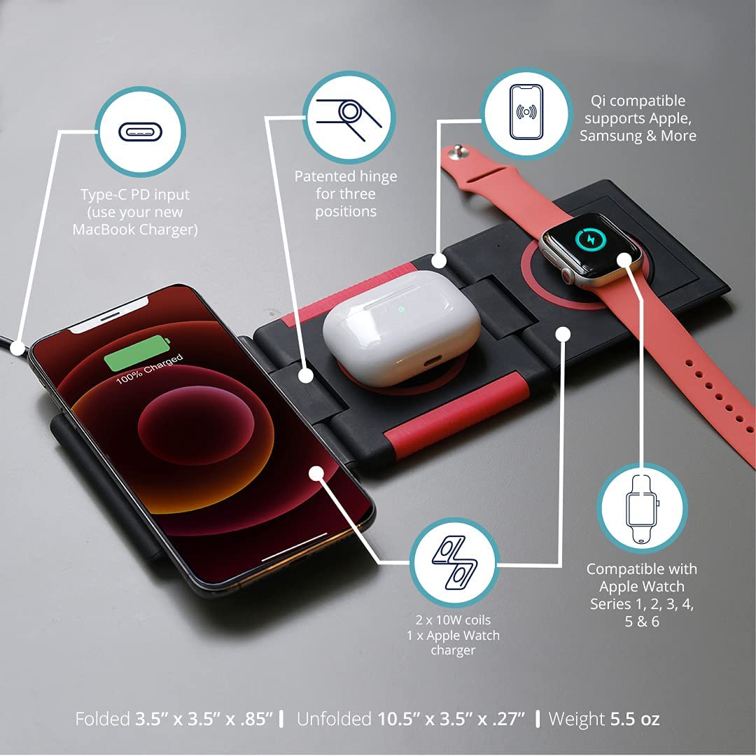 • FOLDABLE TRAVEL-FRIENDLY DESIGN: Patented design folds neatly into a 1" wallet-sized stack for a space-saving single-device charger, use triangle-mode to charge while you Face Time or lay it flat to charge 3 devices at once using its omni charging pads