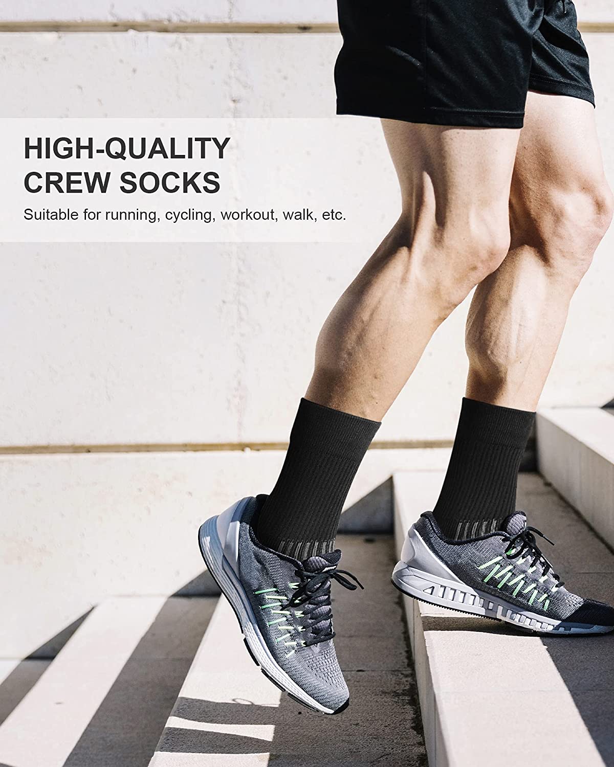 • HIGH QUALITY & DURABLE: Mens compression crew socks are made of high-quality material, which can absorb moisture and sweat and keep your feet dry all day. Reinforced heel and toe area to enhance the durability of the athletic socks, even if worn for a long time. This is not the kind of crew socks you replace after 10 washes!