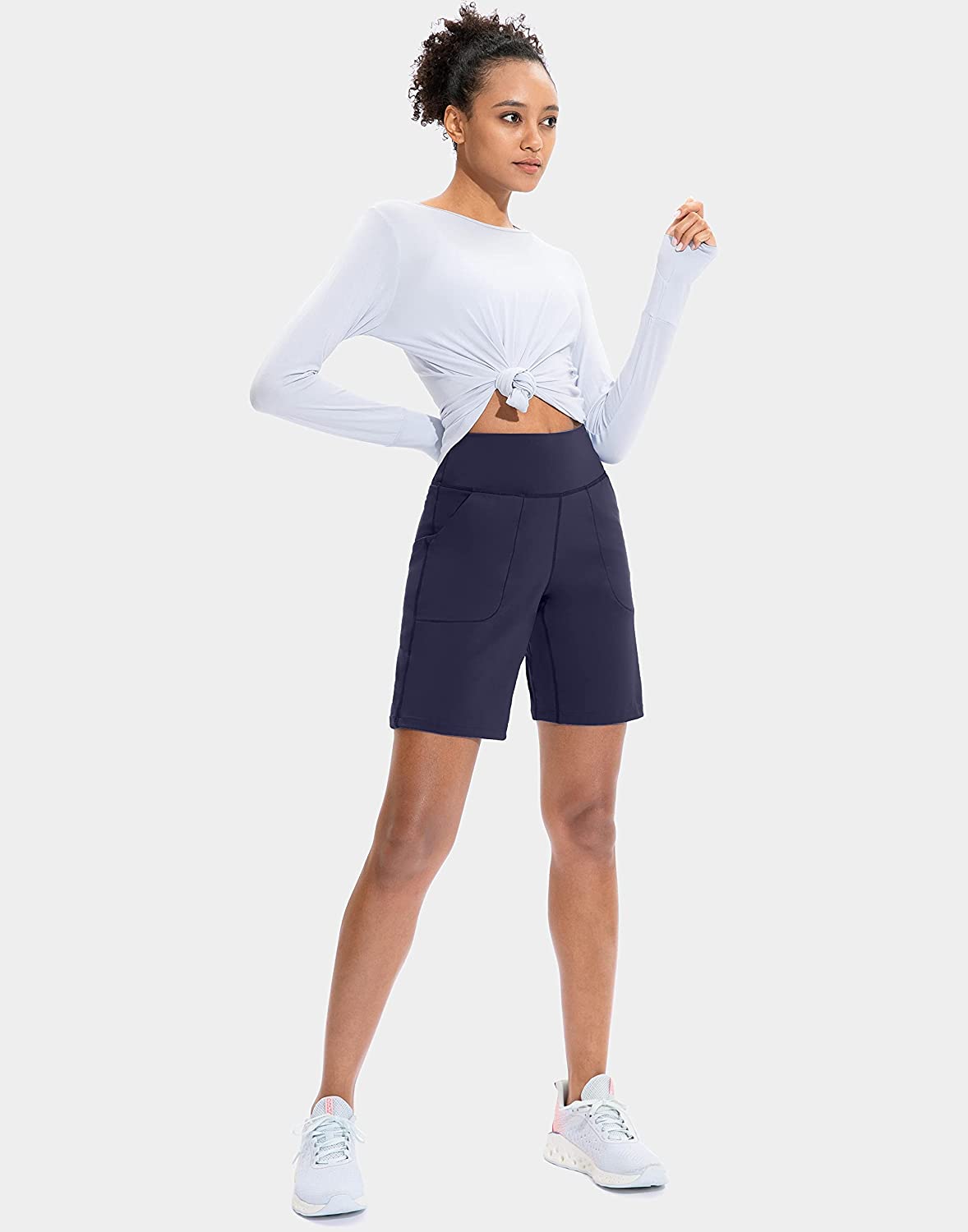 [3 Pockets] The womens bermuda shorts features one back zipper pocket on waistband and two side pockets are deep enough to hold your phone, cards or keys without falling out, free your hands during running or exercise.