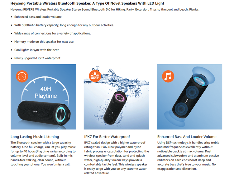 - [ Powerful IPX7 Waterproof Speaker ]: Take your music anywhere, even in the water! The HEYSONG waterproof Bluetooth speaker is fully sealed and can be immersed in up to 1 meter of water for up to 30 minutes. The water vapor in bathroom will never interfere with the sound quality of the waterproof speaker. It's resistant to rain, dust, snow, sand, mud and spills, No worries about weather, a great Bluetooth speaker for Shower, Pool, Beach, Swimming, Surfing, Water Parks, Kayaking, Home, Travel.