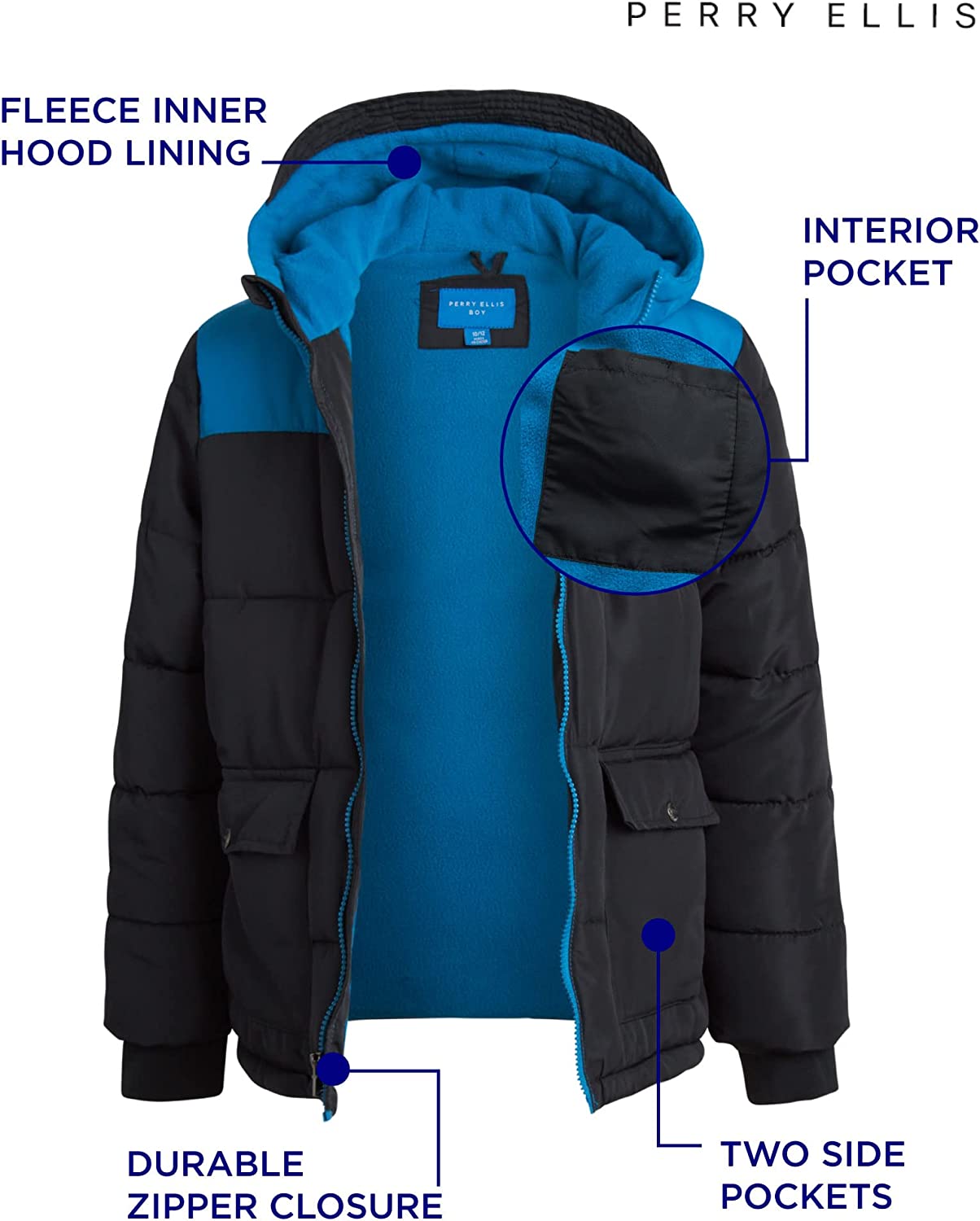 Perry Ellis Boys' Winter Jacket - Fleece Lined Quilted Windbreaker Puffer Jacket with Hood is a great choice for every fashionable little and big boy when the temperature drops. Let your son stay comfortable on chilly days with a lightweight and extra warm windbreaker jacket, including a convenient wide hood, designed with fashion and comfort in mind. Featuring polar fleece lining and side pockets, this stylish puffer jacket is perfect for school, going to the mall, or having fun at the slope. GREAT INSULATION: Your little boy will stay on top of winter weather without being too bulky while the comfy fleece lining and convenient pockets and hood will make his life so much easier during the unpredictable fall and winter seasons. SOFT AND COMFY: Go from chilly to comfy in seconds. This fully-lined with comfy fleece fabric mid-length jacket helps little and big boys adapt perfectly to the weather outside and keeps them warm and stylish every day. DURABLE: Whether he's hanging out on a cold day or having fun in the snow with family and friends, you won't have to worry about ripping and fading. The durable fabric and comfortable inner lining will last through all his outdoor adventures and activities. LIGHTWEIGHT: Our water and wind-resistant windbreaker jacket for boys delivers proper protection against the elements without adding too much weight on his shoulders. EASY TO CLEAN: Simply machine wash and tumble dry; Please Reference the Variations for All Available Sizes & Colors! Perry Ellis Offers Premium Clothing at Affordable Prices because we value every customer that visits our listings! Stop by Our Storefront to See the Rest of Our Great Deals; we're confident you're going to find items that anyone who needs a gift will absolutely love and adore!