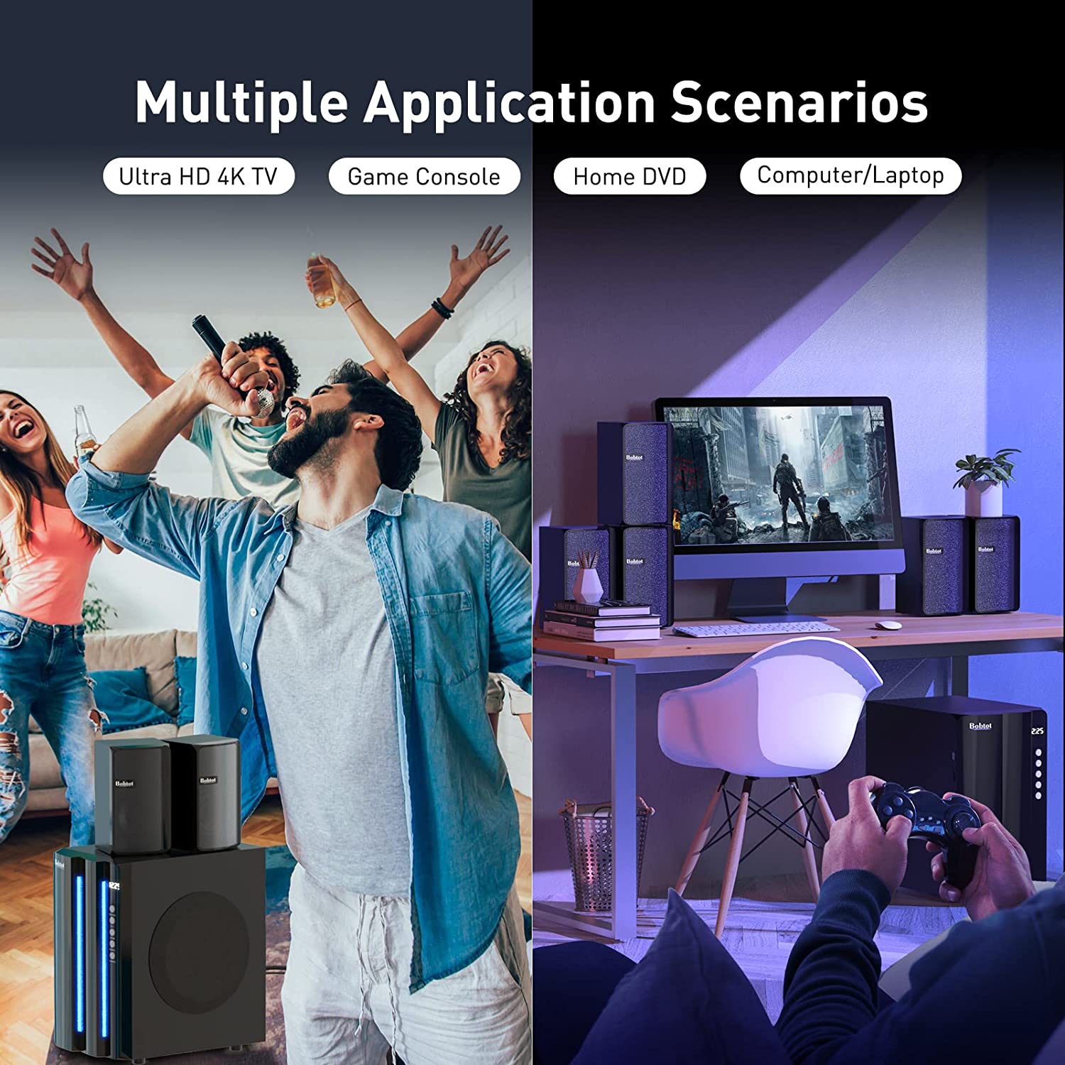 Multiple Application: Just plug and play, speakers have many application scenarios such as Ultra HD 4K TV, game console, home DVD, PC, laptop, projector, or smartphone. It's very suitable for watching movies, watching football games, partying, and e-sports games with friends at home