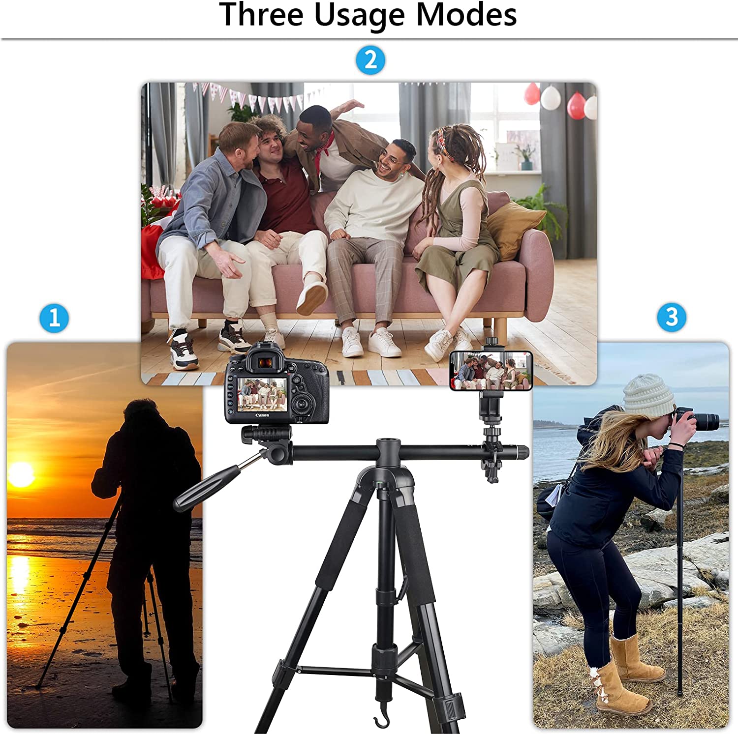 70” Camera Tripod Monopod Horizontal Tripod 3-in-1 Multifunctional Tripod Lightweight Aluminum Tripod with 360° Adjustable Ball Head and Two Phone Holder Mount for DSLR Camera Cell Phone and DV Video