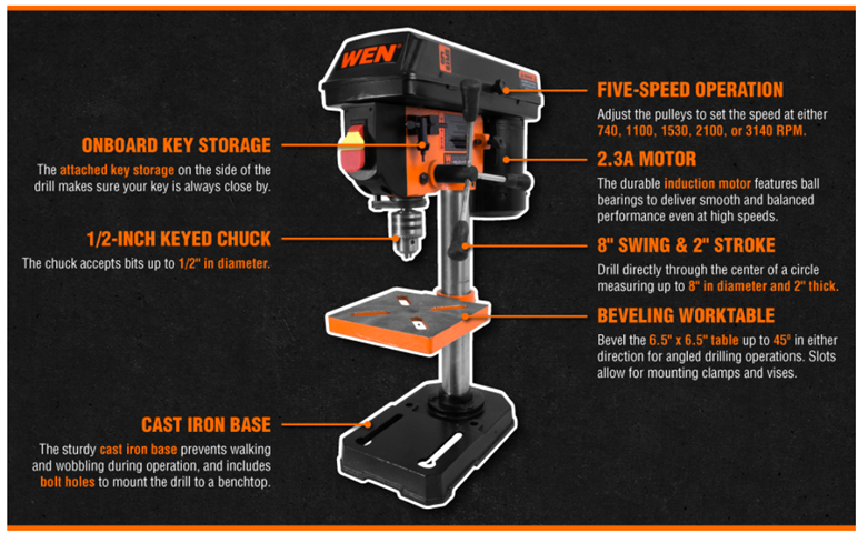 Remember when you could drill with maximum accuracy? Power through metal, wood, plastics, and more with the WEN 8-Inch 5-Speed Drill Press. Don’t let our compact design fool you. Between the five operating speeds, the two-inch spindle travel, and the sturdy construction, you’ll have way more precision than a standard handheld drill. Our 2.3-amp induction motor features ball bearings for smooth balanced performance even at high speed. Manually set your speed to either 740, 1100, 1530, 2100, or 3140 RPM by adjusting the belt position on the two spindles. The easy-to-read, locking depth stop allows for accurate and repeatable drilling operations. The keyed chuck with JT33 spindle taper accepts bits ranging from 1/20 to 1/2 inch in diameter (1.5 to 13 mm). The table bevels 45° left and right for angled drilling. The base is designed with holes for mounting onto a bench or work stand. Clamps and vises are easily mounted to the slotted table, making work-holding safe and effective. And because its a WEN product. a stocked inventory of replacement parts, and a helpful customer phone line. Remember when you could drill holes in almost anything? Remember WEN.