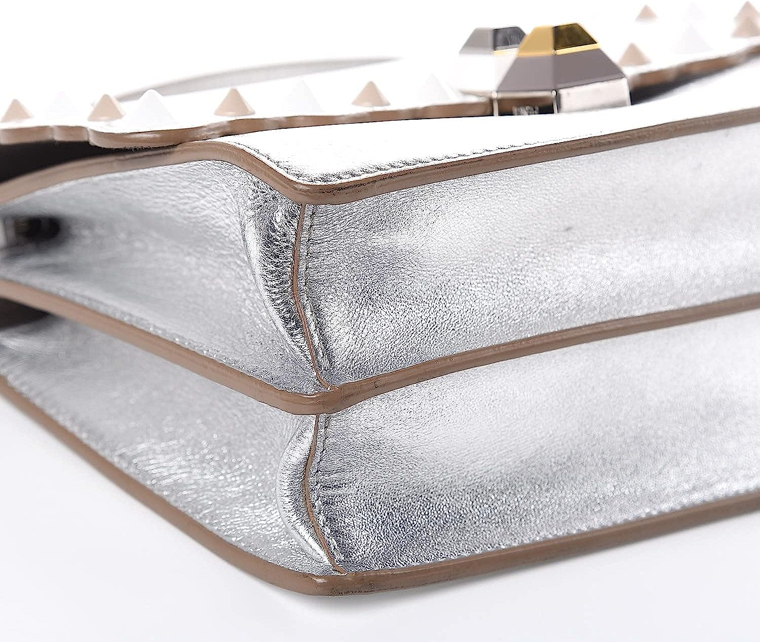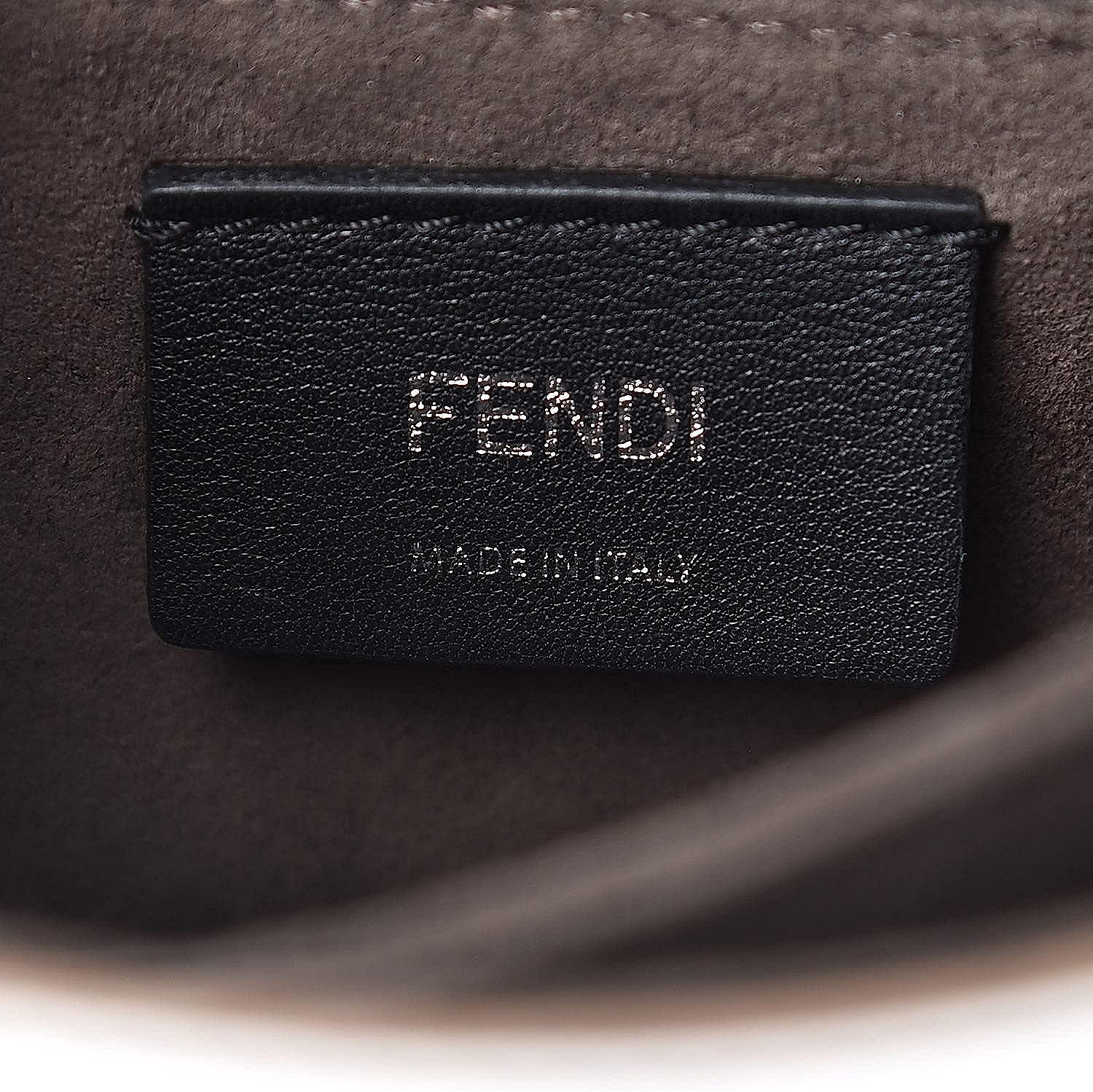 This shoulder bag is crafted of smooth calfskin leather in metallic silver with scalloped edges. This shoulder bag features a long polished silver-tone chain link strap with a shoulder pad and silver rings on the anchor to hold bag charms. The front flap has a decorative pyramid stud closure. The front opens to a partitioned grey suede interior with a patch pocket. This handbag is perfect for day or evening use, from Fendi!