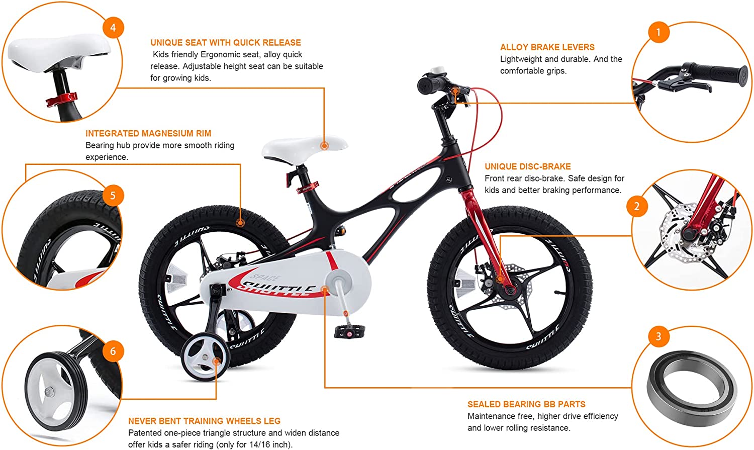 Royalbaby Space Kids Bike 14 16 18 Inch Mg Aluminium Alloy Boys Girls Bicycle Ages 3-9 Years Disc Brakes Dual Handle Brakes Training Wheel Options