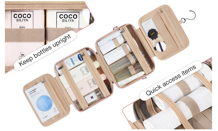 Special Design - 1 front zipper pocket for storing makeup brushes and cosmetics. Detachable shoulder strap provides a variety of ways to carry. Stow-away 360 degree swivel non-slip metal hook for versatile hanging options.