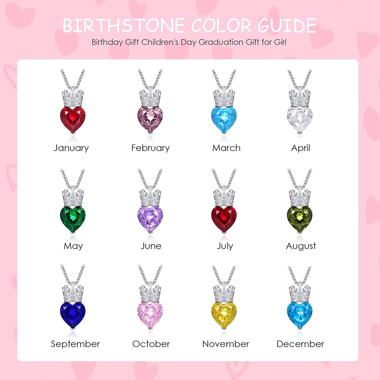CDE Princess Queen Crown Necklace for Girls Women Love Heart Pendant Necklaces with Birthstone Crystal, Christmas Valentine’s Day Birthday Party Jewelry Gifts for Daughter Granddaughter Niece Teen Gir