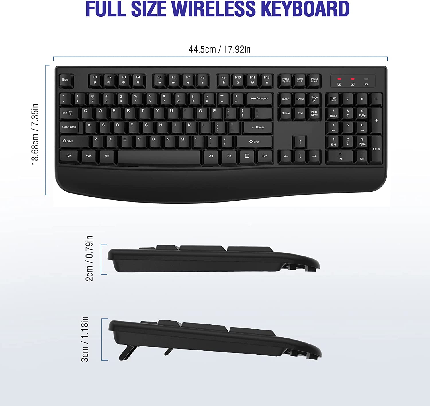 【FULL SIZE 104 KEYS WIRELESS KEYBOARD】Loigys wireless keyboard uses the classic 104-key design with number pad, there are Number Lock indicator/ Caps Lock indicator/ Power indicator in the upper right corner of the keyboard, the bottom of the keyboard is equipped with an adjustable stand.
