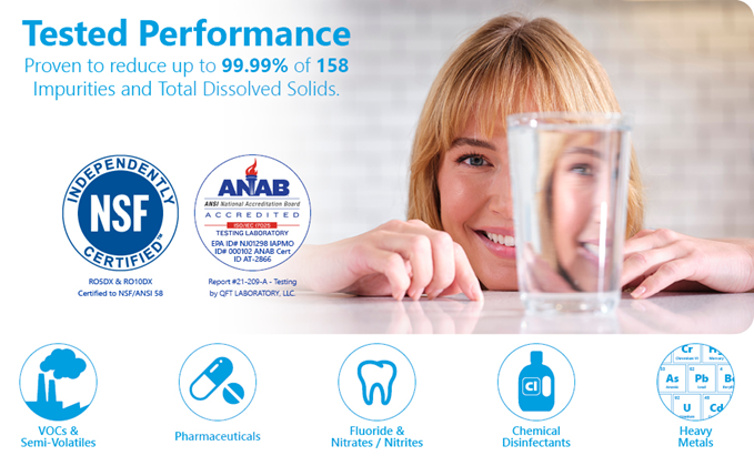 Express Water RO Systems have been independently tested by a third-party ANAB accredited testing laboratory that use established NSF / ANSI drinking water standards, including NSF/ANSI Standards 42, 58, 401 and EPA 524.2, for the reduction of TDS (total dissolved solids), chlorine taste & odors, emerging compound and incidental impurities, and more.
