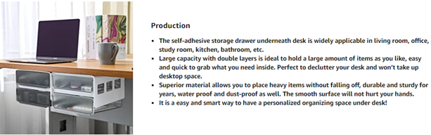 | Special Feature | Under Mounted Drawer, Under Desk Drawer with Two Layers, Self-Adhesive, Hidden Drawer Under Table, Under Desk Drawer Slide-out |