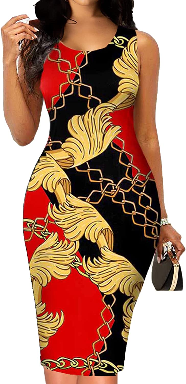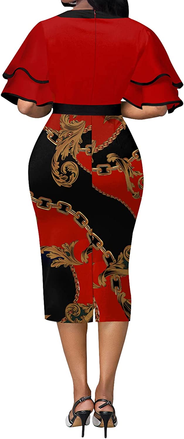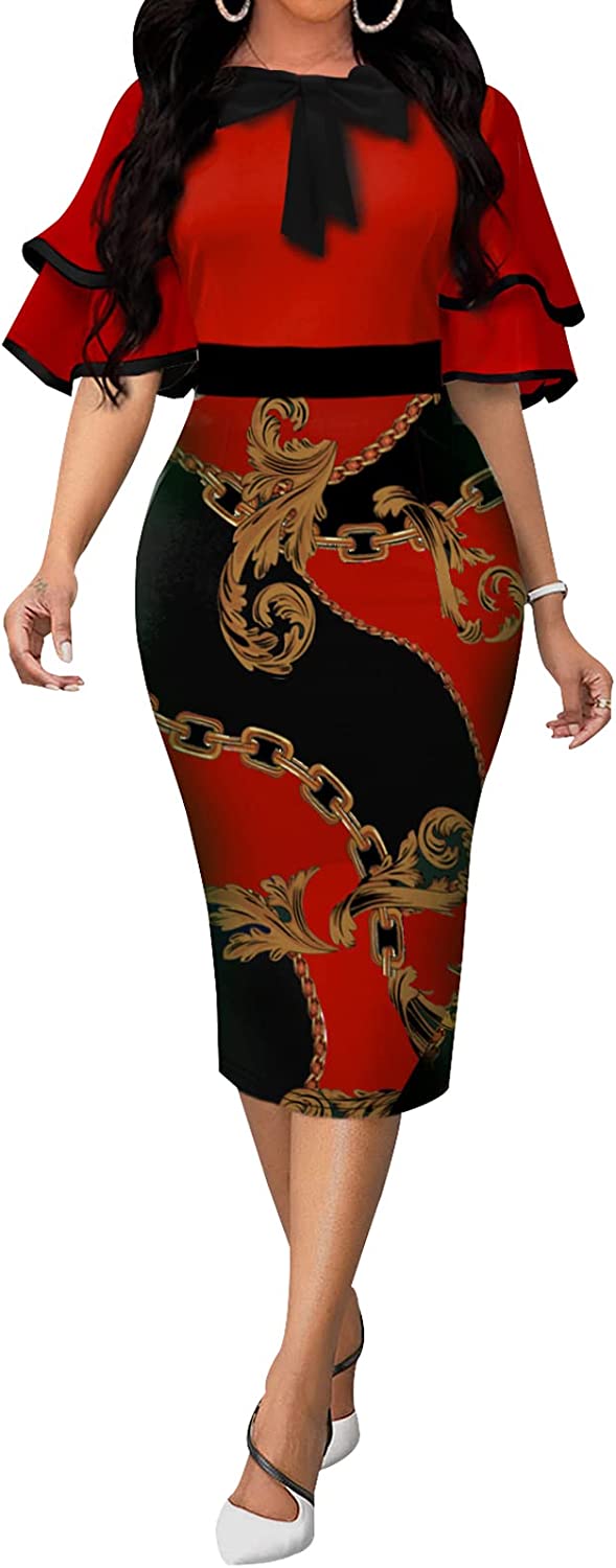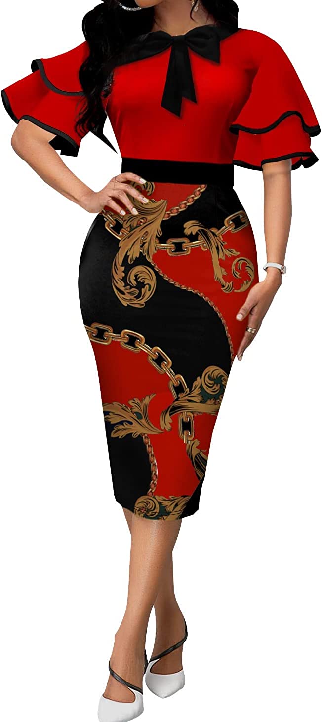 Pencil dress for women elegant features crew neck, short ruffles sleeve, printed pencil dress with bowknot.