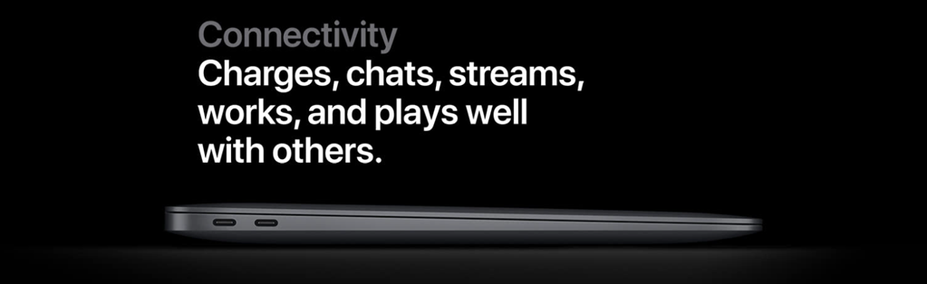 | Charging and Expansion | Two Thunderbolt / USB 4 ports with support for: Charging, DisplayPort, Thunderbolt 3 (up to 40 Gbps), USB 3.1 Gen 2 (up to 10 Gbps) |