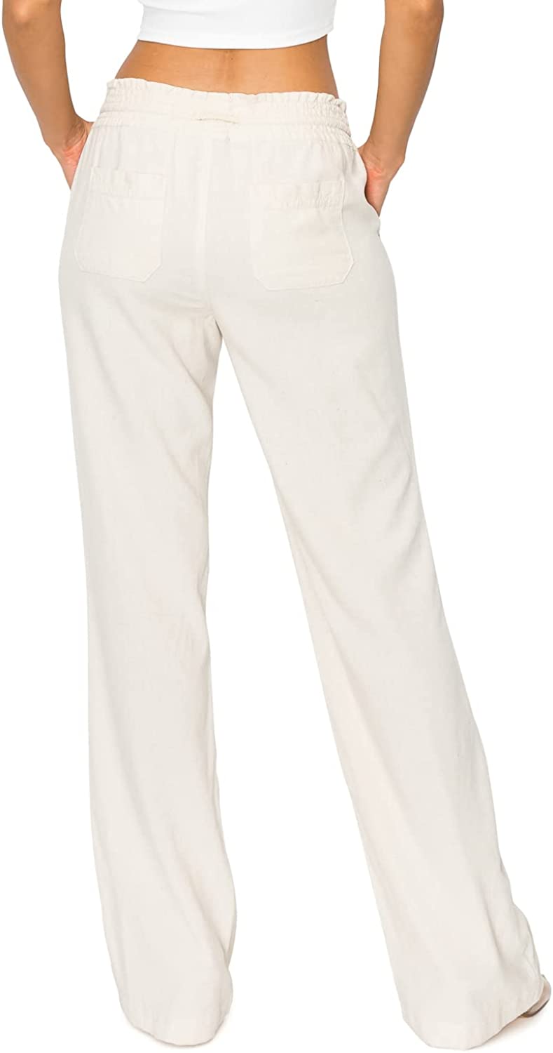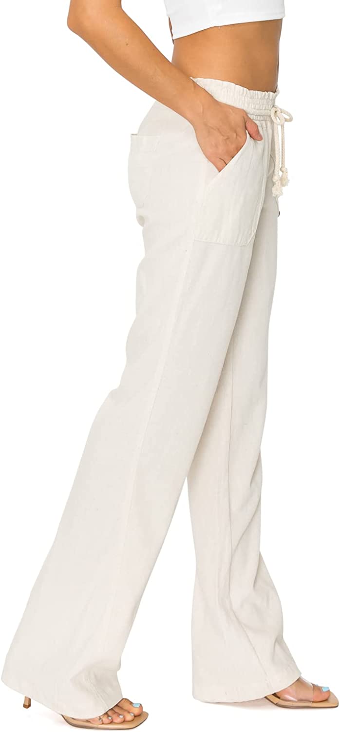 Cali1850 Women's Casual Linen Pants - 32" Inseam Oceanside Drawstring Smocked Waist Lounge Beach Trousers with Pockets