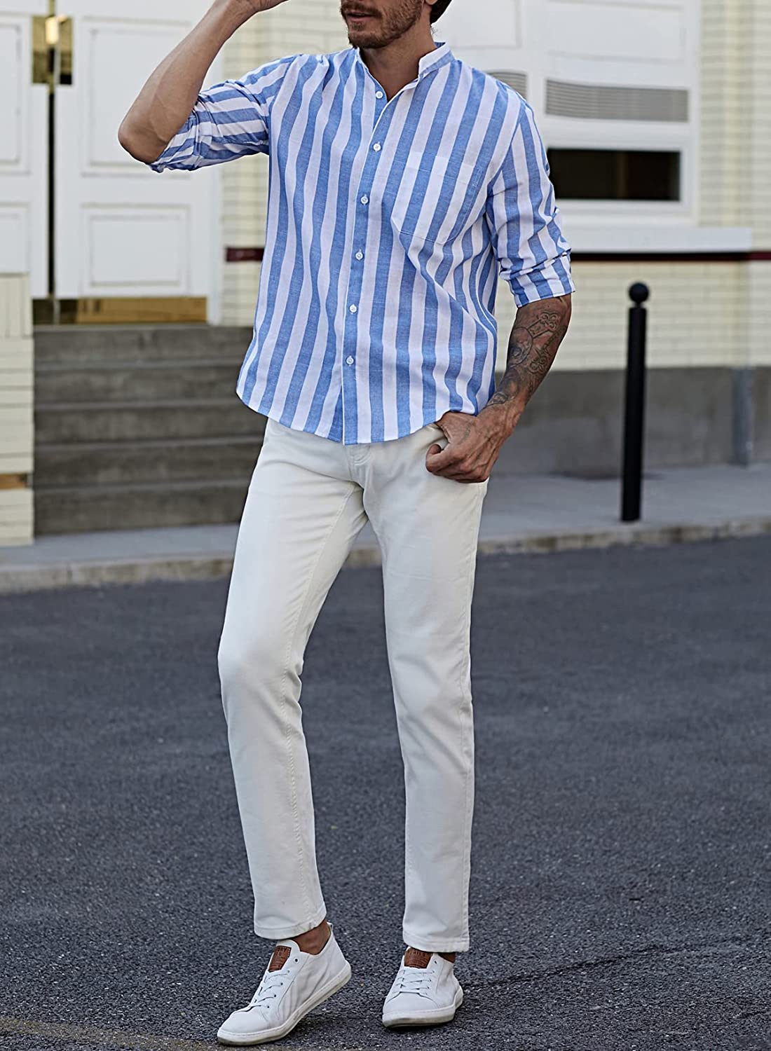 Stylish design: Our shirt features a classic Button-Down Long Sleeve design that looks stylish and contemporary. band collar design,It's perfect for any beach, casual or semi-formal occasion. The shirt is available in various colors that go well with a range of clothing.