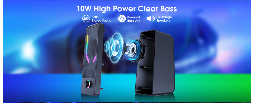 - 【Effortless One-Knob Control】 Delicate one-knob design enables these stereo PC speakers to easily realize ON/OFF, switch light mode, switch mode, and volume up and down instead of complicated independent buttons.