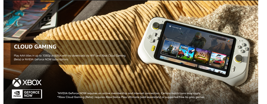 About this item: Handheld gaming device with connectivity to multiple cloud gaming services including Xbox Cloud Gaming and NVIDIA GeForce NOW, up to 1080p and 60fps Play anywhere with Wi-Fi Remote play with the Xbox app and Steam Link app Download more apps from the Google Play App games 7-inch 1080p 60Hz 16:9 touchscreen 12+ hour battery life (1) Lightweight (463 g) handheld gaming console Haptics (2), gyroscope, and remappable controls Certified Carbon Neutral (1) Based on normal streaming play conditions, with 50% screen brightness and 50% volume. Battery life may vary based on user and computing conditions. (2) On compatible games and services.