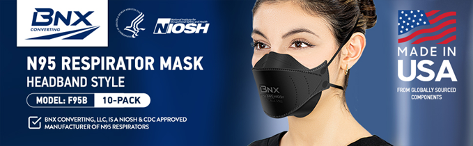 MADE IN USA – Manufactured by BNX Converting LLC in Houston TX, a NIOSH/CDC Approved and FDA Registered (Registration # 3017489417) manufacturer of N95 mask respirators.
