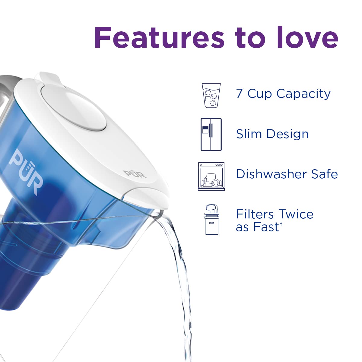 The PUR 7 Cup Water Filter Pitcher offers refreshing water quickly and easily. Each PUR water filter is certified to reduce mercury and certain industrial pollutants, as well as reducing chlorine (taste and odor) and more. The filter lasts up to 2 months and gives you 40 gallons (or 640 8oz cups) of great-tasting water. PUR’s superior filter technology uses activated carbon and ion exchange media and is certified to reduce 2x more contaminants than Brita’s leading water pitcher filter.* The PUR filtered water pitcher has a slim, space-saving design that fits easily in the fridge, while the comfort-grip handle and easy-fill lid make it easy to use. A water filtration system is important because tap water may look clean but can contain potentially harmful contaminants from pipes. Compatible water filter replacements are not certified to offer the same water quality – genuine PUR Filters are the only filters certified for use in PUR systems. Using a PUR water filter system can save up to $1,000 per year on average compared with the cost of bottled water** and help keep plastic bottle waste out of landfills. Each replacement water filter provides 40 gallons of filtered water or up to 2 months of typical use. PUR has been developing innovative technologies for superior water filtration for over 30 years. We believe life deserves PUR water. Disclaimers: PUR does not filter microbes. *Versus best-selling Brita® pitcher filter OB03. Brita® is a trademark of Brita LP. **Based on comparing a year's worth of bottled water (16.9 oz) to a PUR Dispenser a year's worth of 9 refills. Based on Nielsen US Scantrack sales.
