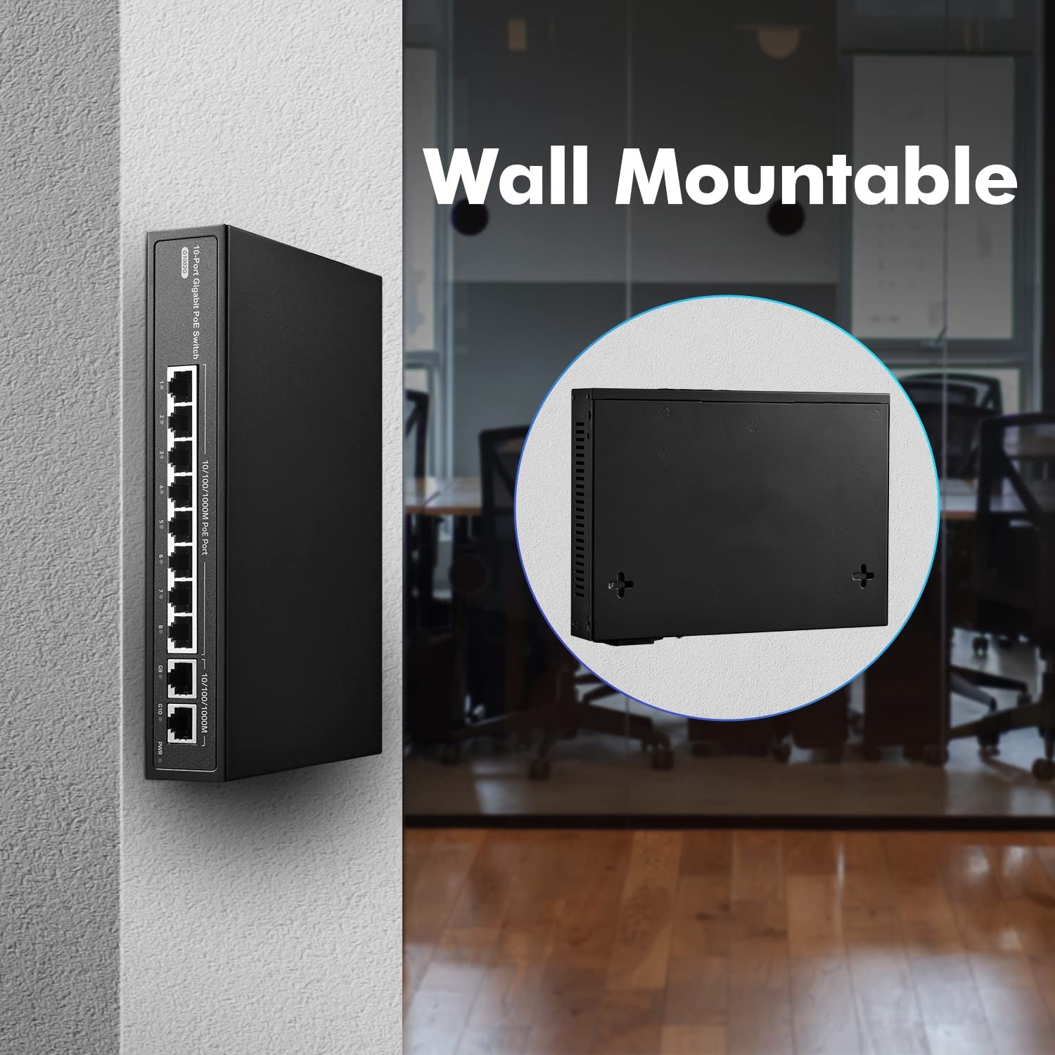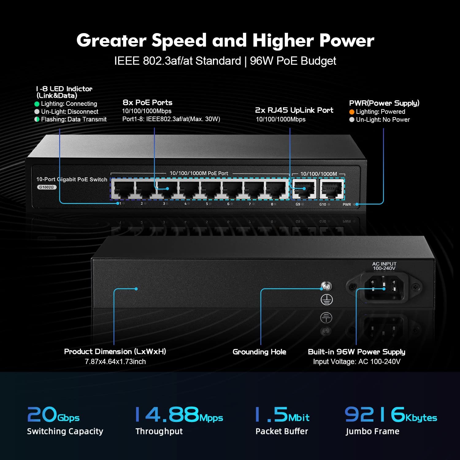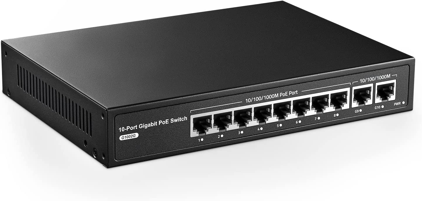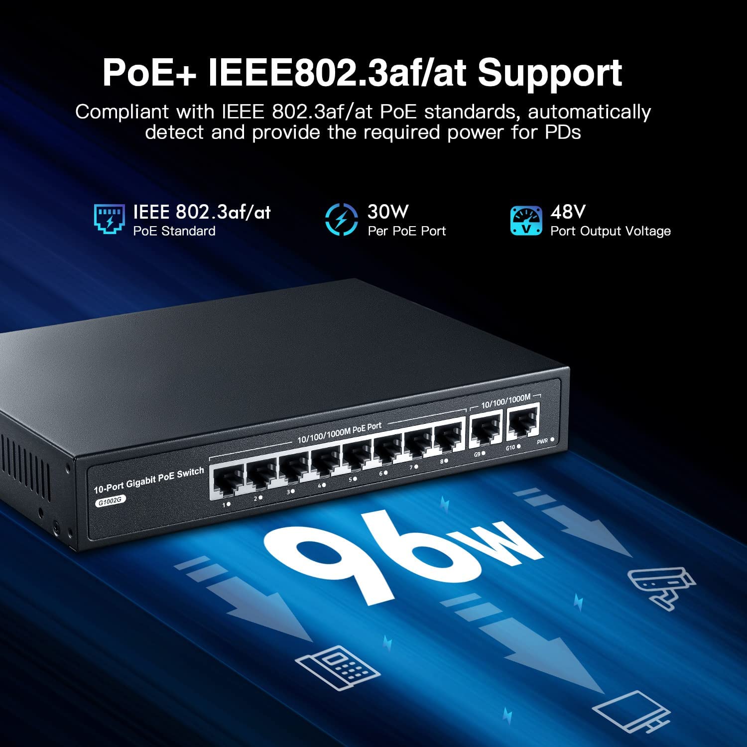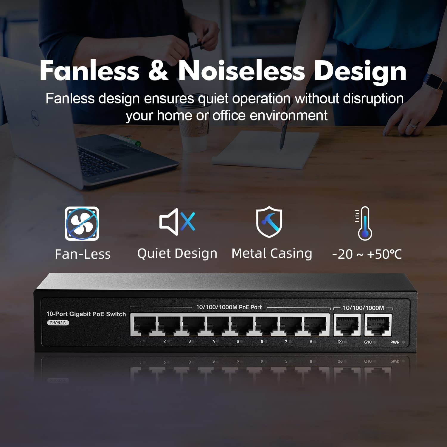 10 Port Gigabit PoE Switch, 8 Port PoE+ and 2 Uplink, 10/100/1000Mbps, IEEE802.3af/at Max 96W, Fanless Unmanaged Plug&Play Ethernet Switch