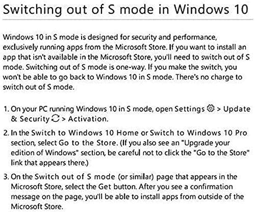 How to switch out of S mode in Windows1. On your PC running Windows 10 in S mode, open Settings > Update & Security > Activation. 2. In the Switch to Windows 10/11 Home or Switch to Windows 10 Pro section, select Go to the Store. (If you also see an "Upgrade your edition of Windows" section, be careful not to click the "Go to the Store" link that appears there.) 3. On the Switch out of S mode (or similar) page that appears in the Microsoft Store, select the Get button. After you see a confirmation message on the page, you'll be able to install apps from outside of the Microsoft Store.